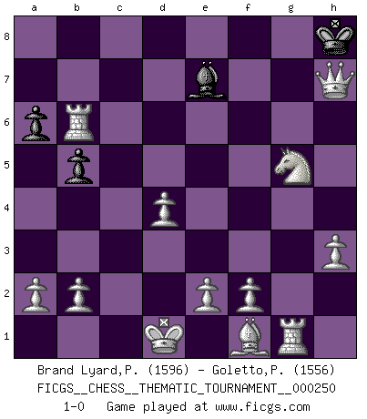 Last move : 1-0 2022 February 8 4:34:15 [Event "FICGS__CHESS__THEMATIC_TOURNAMENT__000250"] [Site "FICGS"] [Date "2022.01.11"] [Round "1"] [White "Brand Lyard,Paul"] [Black "Goletto,Piero Giuseppe"] [Result "1-0"] [WhiteElo "1596"] [BlackElo "1556"] 1.d4 d5 2.Nf3 Nf6 3.c4 e6 4.Nc3 c6 5.Qd3 dxc4 6.Qxc4 b5 7.Qd3 a6 8.g4 Nxg4 9.h3 Nf6 10.Bg5 Nd5 11.Bxd8 Kxd8 12.Nxd5 cxd5 13.Ne5 f6 14.Nf7+ Ke8 15.Nxh8 Bb4+ 16.Kd1 Kf8 17.Qxh7 Ke7 18.Qxg7+ Kd6 19.Qxf6 Nd7 20.Nf7+ Kc6 21.Qxe6+ Kb7 22.Qxd5+ Kc7 23.Qxa8 Nb8 24.Rc1+ Kd7 25.Qd5+ Ke7 26.Rc7+ Kf6 27.Rxc8 Kg7 28.Rxb8 Kg6 29.Rg1+ Kh7 30.Ng5+ Kg7 31.Rb6 Be7 32.Qf7+ Kh8 33.Qh7+ 1-0 Comment by player 1 : Paul Brand Lyard : "One New 2022 Trap for Piero",an very strong trap... And goes goes for the #. Queen's pawn game Player White won this chess game. Follow this game move after move (download)Later, I began to succeed in decisive games. Perhaps because I realized a very simple truth: not only was I worried, but also my opponent. (Mikhail Tal) Es liegt in der Natur, vernüftig zu denken und unlogisch zu handeln. (Anatole France) En la vida, como en el Ajedrez, los Peones propios obstruyen nuestro camino. La gran fortuna de un hombre, su comodidad, placer, hijos, libros, que deberían ayudarle a ganar, con mucha frecuencia lo ponen en Jaque Mate. (Charles Buxton) Un millionnaire : 'Monsieur Steinitz ! Vous ne participez aux tournois que pour l'argent, alors que moi je n'y viens que pour l'honneur.' Steinitz : 'Chacun joue pour ce qu'il n'a pas'... Even the best needles are not sharp at both ends. (Chinese proverb)