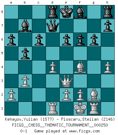 Last move : 0-1 2022 July 4 17:57:30 [Event "FICGS__CHESS__THEMATIC_TOURNAMENT__000250"] [Site "FICGS"] [Date "2022.01.11"] [Round "1"] [White "Kehayov,Yulian"] [Black "Ploscaru,Stelian"] [Result "0-1"] [WhiteElo "1577"] [BlackElo "2146"] 1.d4 d5 2.Nf3 Nf6 3.c4 e6 4.Nc3 c6 5.Qd3 dxc4 6.Qxc4 b5 7.Qd3 a6 8.g4 Nxg4 9.Bf4 Bb7 10.Rg1 Nf6 11.Ne5 Nbd7 12.Bg2 Nd5 13.Nxd5 Nxe5 14.Nc7+ Qxc7 15.Bxe5 Qa5+ 16.Kf1 f6 17.Bf4 Qb4 18.Rc1 Rc8 19.b3 g6 20.h4 Qe7 21.Qf3 Qf7 22.Qe3 Qd7 23.Rd1 Rd8 0-1 Queen's pawn game Player Black won this chess game. Follow this game move after move (download)The passed pawn is a criminal, who should be kept under lock and key. Mild measures, such as police surveillance, are not sufficient. (Nimzovitch) Auf jeden Fall musst du zuerst Rechtsanwalt werden, damit du deine eigenen Interessen und die deiner Familie vertreten kannst. [Brief an seinen Sohn] (José Raúl Capablanca) El Ajedrez es imaginación. (David Bronstein) Karpov est une pièce de musée. (Garry Kasparov) The only sure thing about luck is that it will change. (Wilson Mizner)