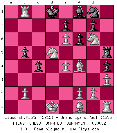Last move : 1-0 2022 February 8 6:41:48 [Event "FICGS__CHESS__UNRATED_TOURNAMENT__000062"] [Site "FICGS"] [Date "2022.01.19"] [Round "1"] [White "Wiaderek,Piotr"] [Black "Brand Lyard,Paul"] [Result "1-0"] [WhiteElo "2212"] [BlackElo "1596"] 1.Nf3 d5 2.d4 Bg4 3.Ne5 h5 4.c4 dxc4 5.h3 Bf5 6.e4 Be6 7.d5 f6 8.Ng6 Rh7 9.dxe6 Qxd1+ 10.Kxd1 b5 11.a4 a6 12.axb5 a5 13.Nc3 h4 14.Nd5 Kd8 15.Bf4 Ra7 16.b6 cxb6 17.Bxb8 Rb7 18.Bf4 b5 19.Rxa5 Rh5 20.Ra8+ Rb8 21.Rxb8+ 1-0 Reti Opening Player White won this chess game. Follow this game move after move (download)My opponents make good moves too. Sometimes I don't take these things into consideration. (Bobby Fischer) Das Schachspiel übertrifft alle anderen Spiele so weit wie der Chimborasso einen Misthaufen. (Arthur Schopenhauer) En un gambito tu regalas un Peón por el bién de tomar un juego perdido. (Samuel Standige Boden) Le jeu d'échecs fait naître et fortifie en nous plusieurs qualités précieuses dans le cours de l'existence, telles que la prévoyance, la circonspection, la prudence, et la persévérance. (Benjamin Franklin - 1783, la morale des échecs) The ultimate in disposing one's troops is to be without ascertainable shape. Then the most penetrating spies cannot pry in nor can the wise lay plans against you. (Sun Tzu)