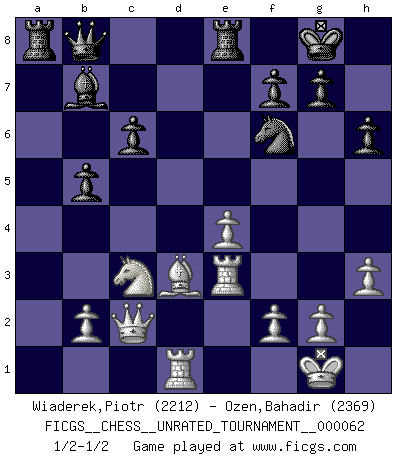 Last move : 1/2-1/2 2022 February 7 7:51:16 [Event "FICGS__CHESS__UNRATED_TOURNAMENT__000062"] [Site "FICGS"] [Date "2022.01.19"] [Round "1"] [White "Wiaderek,Piotr"] [Black "Ozen,Bahadir"] [Result "1/2-1/2"] [WhiteElo "2212"] [BlackElo "2369"] 1.Nf3 d5 2.d4 Nf6 3.c4 e6 4.Nc3 c6 5.e3 Nbd7 6.Qc2 Bd6 7.Bd3 dxc4 8.Bxc4 O-O 9.O-O b5 10.Bd3 Bb7 11.e4 e5 12.Nxe5 Nxe5 13.dxe5 Bxe5 14.h3 a6 15.Be3 Re8 16.a4 Bd4 17.Rfe1 h6 18.axb5 axb5 19.Rad1 Bxe3 20.Rxe3 Qb8 1/2-1/2 Reti Opening Kingside Castling by player Black (move 8) Kingside Castling by player White (move 9) This chess game ended in a draw. Follow this game move after move (download)You know, comrade Pachman, I don't enjoy being a Minister, I would rather play Chess like you. (Che Guevara) Warum muß ich gegen diesen IDIOTEN verlieren? (Aaron Nimzowitsch) Yo no creo en la psicología. Yo creo en las buenas movidas. (Bobby Fischer) Même si vous avez un bon coup à faire, regardez toujours s'il n'y en a pas un qui lui soit préférable. (Pedro Damiano) My poor ole parrot... Is not in the circulation of displays ....poo hoo hoo :) (Wayne Lowrance's enigma)