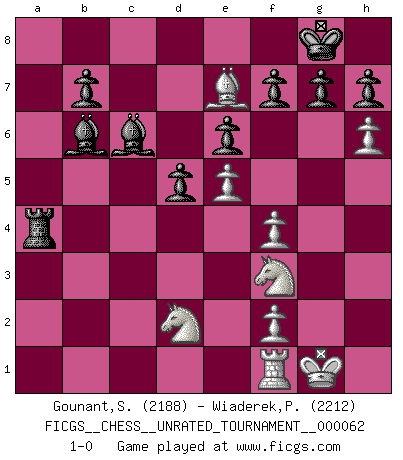 Last move : 1-0 2022 February 13 7:12:22 [Event "FICGS__CHESS__UNRATED_TOURNAMENT__000062"] [Site "FICGS"] [Date "2022.01.19"] [Round "1"] [White "Gounant,Stanislas"] [Black "Wiaderek,Piotr"] [Result "1-0"] [WhiteElo "2188"] [BlackElo "2212"] 1.e4 c6 2.d4 d5 3.e5 c5 4.dxc5 e6 5.a3 Bxc5 6.Nf3 Ne7 7.b4 Bb6 8.Bb2 a5 9.Nbd2 O-O 10.Bd3 Ng6 11.h4 axb4 12.h5 Nf4 13.Bf1 Nc6 14.axb4 Rxa1 15.Qxa1 Nxb4 16.Qb1 Qc7 17.g3 Qxc2 18.gxf4 Qxb1+ 19.Nxb1 Bd7 20.Be2 Ra8 21.O-O Ra2 22.Bc3 Rxe2 23.Bxb4 Ra2 24.Nbd2 Bc6 25.h6 Ra4 26.Be7 1-0 Caro-Kann : Advance variation Kingside Castling by player Black (move 9) Kingside Castling by player White (move 21) Player White won this chess game. Follow this game move after move (download)Chess is played with the mind and not with the hands ! (Renaud and Kahn) Es gibt nur zwei wahre Schachgenies - das andere war Wilhelm Steinitz, der Weltmeister von 1872 bis 1894. (Robert James Fischer) El jugador blanco perdió porque fallo en recordar la coreccta continuación y tuvo que pensar por sí mismo las movidas. (Siegbert Tarrasch) Il n'y a pas eu de défaite parce que je ne crois pas que cet ordinateur ait jamais existé. IBM a triché en refusant d'imprimer les modes de recherche de la machine. C'est évident, pendant le match, des coups décisifs ont été joués par des êtres humains. Aujourd'hui, les meilleurs spécialistes en informatique ne peuvent toujours pas expliquer comment Deep-Blue a pu jouer contre la logique des ordinateurs. IBM a gagné une guerre de communication, mais ils sont incapables de prouver que l'ordinateur a gagné tout seul. (Garry Kasparov) At last I discovered the true beauty of chess. So I proposed to her. (Dinesh De Silva)