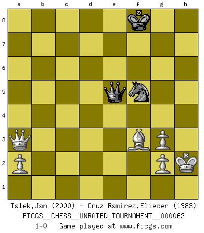 Last move : 1-0 2022 March 27 14:49:23 [Event "FICGS__CHESS__UNRATED_TOURNAMENT__000062"] [Site "FICGS"] [Date "2022.01.19"] [Round "1"] [White "Talek,Jan"] [Black "Cruz Ramirez,Eliecer"] [Result "1-0"] [WhiteElo "2000"] [BlackElo "1983"] 1.e4 e5 2.Nf3 Nc6 3.Nc3 Nf6 4.d4 exd4 5.Nxd4 Bb4 6.Nxc6 bxc6 7.Bd3 d5 8.exd5 cxd5 9.O-O O-O 10.Bg5 Be6 11.Ne2 h6 12.Bh4 Bd6 13.Nd4 Bd7 14.Re1 c5 15.Nf3 g5 16.Bg3 Bxg3 17.hxg3 Qb6 18.c4 Qxb2 19.Re2 Qb6 20.cxd5 Bg4 21.Bc4 Qd6 22.Qa4 Bd7 23.Qa5 Rfe8 24.Rxe8+ Bxe8 25.Rc1 Nxd5 26.Bb3 Rc8 27.Qd2 Rd8 28.Rd1 Bc6 29.Qb2 Qe6 30.Ne5 Ba8 31.Rd3 Rc8 32.Kh2 Re8 33.f4 Rd8 34.Qc2 Kg7 35.Qxc5 Qb6 36.Qc1 f6 37.Nf3 Ne7 38.Re3 Nf5 39.Re6 Rd6 40.Rxd6 Nxd6 41.fxg5 hxg5 42.Nxg5 fxg5 43.Qxg5+ Kf8 44.Qg8+ Ke7 45.Qxa8 Qd4 46.Qg8 Kd7 47.Qh7+ Kc6 48.Qh4 Qe5 49.Qa4+ Kb7 50.Bd1 Nf5 51.Bf3+ Kc8 52.Qc6+ Kd8 53.Qa8+ Ke7 54.Qxa7+ Kf8 55.Qa3+ 1-0 Four knights : Scotch, 4...exd4 Kingside Castling by player White (move 9) Kingside Castling by player Black (move 9) 10 pieces endgame at move 45 : White KQBPPP , Black KQNP WHITE : King + 1 Queen 1 Bishop 3 Pawns BLACK : King + 1 Queen 1 Knight 1 Pawn 9 pieces endgame at move 54 : White KQBPPP , Black KQN WHITE : King + 1 Queen 1 Bishop 3 Pawns BLACK : King + 1 Queen 1 Knight Player White won this chess game. Follow this game move after move (download)Checkers is for tramps. (Paul Morphy) Um sich vor der Gefahr einer Erkältung zu schützen, sorge der wanderlustige König beizeiten für ein brauchbares Versteck. (Aaron Nimzowitsch) Solo el jugador con la iniciativa tiene el derecho a atacar. (Wilhelm Steinitz) Le système Elo représente seulement une moyenne. Il est simplement un indicateur de votre stabilité. (Anatoli Karpov) O divine art of subtlety and secrecy! Through you we learn to be invisible, through you inaudible and hence we can hold the enemy's fate in our hands. (Sun Tzu)