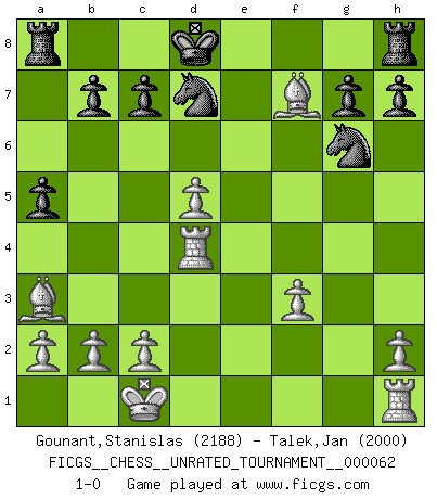 Last move : 1-0 2022 February 5 20:27:31 [Event "FICGS__CHESS__UNRATED_TOURNAMENT__000062"] [Site "FICGS"] [Date "2022.01.19"] [Round "1"] [White "Gounant,Stanislas"] [Black "Talek,Jan"] [Result "1-0"] [WhiteElo "2188"] [BlackElo "2000"] 1.e4 e5 2.f4 d5 3.exd5 e4 4.d3 Nf6 5.dxe4 Nxe4 6.Nf3 Bc5 7.Qe2 Bf5 8.Nc3 Qe7 9.Be3 Nxc3 10.Bxc5 Nxe2 11.Bxe7 Nxf4 12.Ba3 Nd7 13.O-O-O Be4 14.Rd4 Bxf3 15.gxf3 Ng6 16.Bh3 Kd8 17.Be6 a5 18.Bxf7 1-0 KGD : Falkbeer, Main line, 7...Bf5 Queenside Castling by player White (move 13) Player White won this chess game. Follow this game move after move (download)All my games are real. (Bobby Fischer) Wenn ich Weiß habe gewinne ich weil ich Weiß habe, wenn ich Schwarz habe gewinne ich weil ich Bogoljubov bin. (Efim Bogoljubov) Fischer es el jugador mas fuerte del mundo. De hecho, el jugador mas fuerte que jamas haya existido. (Larry Evans) J'ai toujours senti une vague pitié pour l'homme qui ne connaît rien aux échecs, tout comme j'en aurais pour un homme ignorant de l'amour. Les Echecs, comme la musique ou comme l'amour, ont le pouvoir de rendre heureux. (Siegbert Tarrasch) Cactus - It is depressed cucumber. (Ilmars Cirulis)