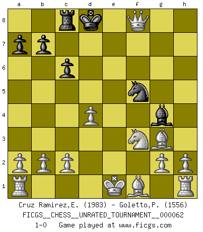 Last move : 1-0 2022 April 20 12:25:58 [Event "FICGS__CHESS__UNRATED_TOURNAMENT__000062"] [Site "FICGS"] [Date "2022.01.19"] [Round "1"] [White "Cruz Ramirez,Eliecer"] [Black "Goletto,Piero Giuseppe"] [Result "1-0"] [WhiteElo "1983"] [BlackElo "1556"] 1.e4 e5 2.f4 exf4 3.Nf3 Nc6 4.d4 Nf6 5.Qe2 d5 6.exd5 Ne7 7.Nc3 Bg4 8.Bxf4 Nfxd5 9.Nxd5 c6 10.Nc7+ Qxc7 11.Bxc7 Rc8 12.Bg3 g6 13.Qe5 f6 14.Qxf6 Ng8 15.Qxh8 Ne7 16.Qxh7 Nf5 17.Qxg6+ Kd8 18.Qg5+ Be7 19.Qg8+ Bf8 20.Qxf8+ 1-0 This chess game has been lost on time (started : 2022.01.19 2:40:10) King's knight's gambit Player White won this chess game. Follow this game move after move (download)The sign of a great Master is his ability to win a won game quickly and painlessly. (Irving Chernev) Der 70jährige Viktor Kortschnoi: Die Rentenanstalt wollte mich zwingen in Rente zu gehen. Meine Frau erhält jetzt eine Pension- und ich zahle weiter in die Rentenkasse ein! (Viktor Kortschnoi) Tu sabes que vas a perder. Aún cuando tenía la ventaja, yo sabía que iba a perder. - al estar jugando con Fischer (Andrew Soltis) À la honte des hommes, on sait que les lois du jeu sont les seules qui soient partout justes, claires, inviolables et exécutées. Pourquoi l'Indien qui a donné les règles du jeu d'échecs est-il obéi de bon gré dans toute la terre, et que les décrétales des papes, par exemple, sont aujourd'hui un objet d'horreur et de mépris ? C'est que l'inventeur des échecs combina tout avec justesse pour la satisfaction des joueurs, et que les papes, dans leurs décrétales, n'eurent en vue que leur seul avantage. L'Indien voulut exercer également l'esprit des hommes et leur donner du plaisir; les papes ont voulu abrutir l'esprit des hommes. Voltaire (Dictionnaire philosophique / Garnier 1967) Without enthusiasm, virtue functions not at all, and vice only poorly. (Mignon McLaughlin, The Neurotic's Notebook, 1960)