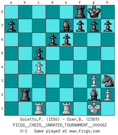 Last move : 0-1 2022 March 16 6:54:52 [Event "FICGS__CHESS__UNRATED_TOURNAMENT__000062"] [Site "FICGS"] [Date "2022.01.19"] [Round "1"] [White "Goletto,Piero Giuseppe"] [Black "Ozen,Bahadir"] [Result "0-1"] [WhiteElo "1556"] [BlackElo "2369"] 1.e4 c5 2.Nf3 d6 3.Nc3 Nf6 4.Bb5+ Bd7 5.O-O Bxb5 6.Re1 Bc6 7.d3 Nbd7 8.Bg5 e6 9.Bf4 Be7 10.Ne2 O-O 11.Rc1 b5 12.c4 bxc4 13.dxc4 Nxe4 14.Nc3 Nxc3 15.bxc3 Nf6 16.a4 Qa5 17.Nd2 Rab8 18.Nb3 Qxa4 19.Ra1 Qxb3 20.Rb1 Qxd1 21.Rexd1 Ne4 22.f3 Nxc3 23.Rbc1 Ne2+ 24.Kf2 Nxf4 25.g3 Rb2+ 26.Kf1 Bxf3 27.Re1 Bg2+ 28.Kg1 Nh3+ 0-1 Sicilian Kingside Castling by player White (move 5) Kingside Castling by player Black (move 10) Player Black won this chess game. Follow this game move after move (download)It's always better to sacrifice your opponent's men. (Savielly Tartakover) Versuche, dich von der Sklaverei der Eröffnungsvarianten zu befreien. Stattdessen soll man gewisse Typenpositionen erlernen, die man eingehend analysiert. (Aaron Nimzowitsch) Yo jugué Ajedrez con el y a veces le pude haber ganado solo que siempre devuelve su última jugada y juega la partida de manera diferente. (Mark Twain) Il n'y a plus de joueurs du niveau de Jacob Murray dont la seule quête est le beau jeu, le plaisir de voir les pièces construire quelque chose. Sur 10 idées à la minute, 9 seront sans intérêt, la dernière s'avèrera géniale. (Christian Bauer) A generalist learns less and less about more and more until he knows nothing about everything. (Author unknown)