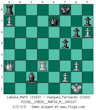 Last move : 1/2-1/2 2022 June 2 5:34:36 [Event "FICGS__CHESS__RAPID_M__000127"] [Site "FICGS"] [Date "2022.01.19"] [Round "1"] [White "LaDuke,Matt"] [Black "Vasquez,Fernando"] [Result "1/2-1/2"] [WhiteElo "2163"] [BlackElo "2164"] 1.e4 e5 2.Nf3 Nf6 3.d4 Nxe4 4.Bd3 d5 5.Nxe5 Nd7 6.Nxd7 Bxd7 7.O-O Bd6 8.Nc3 Nxc3 9.bxc3 O-O 10.Qh5 f5 11.Re1 g6 12.Qf3 c6 13.Bf4 Qc7 14.Bxd6 Qxd6 15.c4 Rae8 16.c5 Qc7 17.a4 b6 18.Bb5 bxc5 19.Rxe8 Rxe8 20.Bf1 cxd4 21.Rd1 Qb6 22.h4 Qb2 23.Qf4 Qxc2 24.Rc1 Qb2 25.h5 Re6 26.a5 Qb4 27.Qc7 Be8 28.Qxa7 d3 29.Bxd3 Qd2 30.Rf1 Qxd3 31.h6 Bf7 32.a6 Re8 33.Ra1 d4 34.Qd7 Qc3 35.Rd1 Qc5 36.a7 Ra8 37.Ra1 d3 38.Qb7 Qf8 39.Rd1 Bc4 40.Qxc6 Qc8 41.Qb6 Ba2 42.Qa5 Be6 43.Rb1 d2 44.Qa1 d1Q+ 45.Rxd1 Qc7 46.g3 Bb3 47.Rd3 Bc2 48.Qa2+ Kf8 49.Qa3+ Qe7 1/2-1/2 Petrov : Modern attack, Symmetrical variation Kingside Castling by player White (move 7) Kingside Castling by player Black (move 9) Promotion Queen by player Black (move 44) This chess game ended in a draw. Follow this game move after move (download)Fischer, who may or may not be mad as a hatter, has every right to be horrified. (Jeremy Silman) Ich glaube nicht an Psychologie, ich glaube an gute Züge. (Robert James Fischer) No es tiempo de jugar al Ajedrez cuando la casa esta en llamas. (Proverbio Italiano) L'action d'une oeuvre littéraire se déroule sur un champ de bataille. Les masques et les types du drame moderne correspondent aux pièces du jeu d'échecs. L'intrigue correspond aux coups et aux gambits, c'est à dire aux techniques du jeu telles qu'utilisées et interprétées par les joueurs. Les tactiques et les péripéties [mouvements] correspondent aux coups exécutés par l'adversaire. (Viktor Shklovsky) An expert is a man who has made all the mistakes which can be made in a very narrow field. (Niels Bohr)