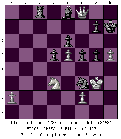 Last move : 1/2-1/2 2022 March 19 21:24:45 [Event "FICGS__CHESS__RAPID_M__000127"] [Site "FICGS"] [Date "2022.01.19"] [Round "1"] [White "Cirulis,Ilmars"] [Black "LaDuke,Matt"] [Result "1/2-1/2"] [WhiteElo "2261"] [BlackElo "2163"] 1.d4 e6 2.e4 d5 3.e5 c5 4.c3 Nc6 5.Nf3 Qb6 6.Bd3 cxd4 7.O-O Bd7 8.Re1 Nge7 9.h4 h6 10.h5 Rc8 11.Nbd2 dxc3 12.bxc3 Na5 13.Rb1 Qc7 14.Ba3 Qxc3 15.Nb3 Nec6 16.Rc1 Qxe1+ 17.Qxe1 Bxa3 18.Nxa5 Bxc1 19.Nxb7 Ba3 20.Qe3 O-O 21.Bc2 Nb4 22.Bh7+ Kxh7 23.Qxa3 Rb8 24.Nc5 Rfd8 25.g4 Be8 26.g5 Rdc8 27.Qxa7 Nc6 28.Qa3 Rb4 29.Kh2 hxg5 30.Nd3 Rg4 31.Qf8 Nd4 32.Kh3 Nxf3 33.Kxg4 f5+ 34.Kg3 1/2-1/2 Queen's pawn Kingside Castling by player White (move 7) Kingside Castling by player Black (move 20) This chess game ended in a draw. Follow this game move after move (download)What would Chess be without silly mistakes ? (Kurt Richter) Die Jungen erwarten, dass Opa einfach umfällt. Dann aber kann Opa fünf Stunden lang Schach spielen und die jungen Gegner an die Wand drücken. (Viktor Kortschnoi) Estaba muy claro de que el punto vulnerable del Gran Maestro Americano (Bobby Fischer) radicaba en las posiciones de doble filo, colgantes, irracionales, donde el siempre falló en encontrar un triunfo aún en una posición de clara victoria. (Efim Geller) Le joueur d'Echecs qui veut atteindre le top est obligé de développer son propre credo créatif. Alexeï Stepanovicth Souétine. Il est facile d'écrire des livres ! Ce qui est difficile, c'est de jouer ! (Alexeï Stepanovicth Souétine) Whoever said the pen is mightier than the sword obviously never encountered automatic weapons. (US General Douglas MacArthur)