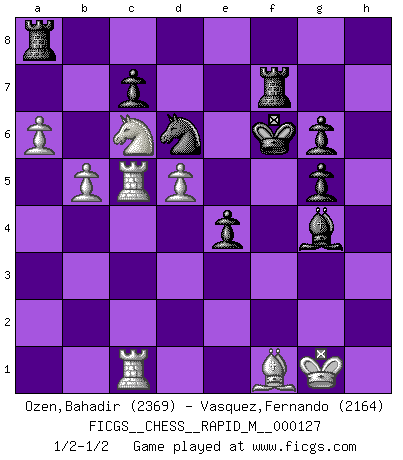 Last move : 1/2-1/2 2022 June 13 12:43:32 [Event "FICGS__CHESS__RAPID_M__000127"] [Site "FICGS"] [Date "2022.01.19"] [Round "1"] [White "Ozen,Bahadir"] [Black "Vasquez,Fernando"] [Result "1/2-1/2"] [WhiteElo "2369"] [BlackElo "2164"] 1.c4 e5 2.g3 Nf6 3.d3 Nc6 4.Nc3 Bb4 5.Bg2 O-O 6.Bd2 d6 7.Nf3 a6 8.O-O h6 9.Nd5 Bxd2 10.Nxd2 Bg4 11.h3 Be6 12.Rb1 Rb8 13.b4 Nd7 14.e3 Ne7 15.Nxe7+ Qxe7 16.Qc2 Rfe8 17.a4 Nf6 18.b5 a5 19.Kh2 Bf5 20.e4 Be6 21.Qc3 b6 22.f4 Bd7 23.Rf2 exf4 24.Rxf4 Nh5 25.Rf2 Qg5 26.Nf1 Re7 27.Qd2 Be6 28.Qxg5 hxg5 29.Ne3 Nf6 30.Bf3 Nd7 31.d4 Nf6 32.g4 Rbe8 33.Re1 Kh7 34.Bg2 Kg8 35.Rfe2 Rd8 36.Rc2 Kf8 37.Kg3 Rde8 38.Rce2 Rd8 39.Rh1 g6 40.Kh2 Kg7 41.Rc1 Rh8 42.Kg1 Rd8 43.Rf2 Rb8 44.Rcf1 Ng8 45.Re1 Rd8 46.Rc1 Nf6 47.Rd1 Rb8 48.Rdf1 Ng8 49.Re1 Nf6 50.Rc1 Rd8 51.Rcf1 Ng8 52.Kh2 Nh6 53.Kg1 Rf8 54.e5 dxe5 55.d5 Bc8 56.c5 bxc5 57.Rc2 f5 58.Rxc5 Nf7 59.Nc4 e4 60.Nxa5 Nd6 61.Nc6 Ref7 62.Rfc1 Kf6 63.a5 Bd7 64.a6 Ra8 65.Bf1 fxg4 66.hxg4 Bxg4 67.Nb4 Ra7 68.Nc6 Ra8 1/2-1/2 English Opening Kingside Castling by player Black (move 5) Kingside Castling by player White (move 8) This chess game ended in a draw. Follow this game move after move (download)If cunning alone were needed to excel, women would be the best Chess players. (Albin) Fischer: 'Remis!?' Uhlmann: 'Aber es muss doch dreimal Zugwiederholung sein!' Fischer: 'Sie nehmen das Remis an, wie ich es sage, sonst spiele ich weiter und werde Sie dann schlagen!' (Robert James Fischer) Bobby es el jugador de Ajedrez mas fino que este país jamás haya producido. Su memoria para las movidas, su brillantez en soñar combinaciones y su feróz determinación por la victoria son algo extraño. (John Collins) Assurément je connaissais par expérience le mystérieux attrait de ce jeu royal, le seul entre tous les jeux inventés par les hommes qui échappe souverainement à la tyrannie du hasard, le seul où l'on ne doive sa victoire qu'à son intelligence ou plutôt à une certaine forme d'intelligence. Mais n'est-ce pas déjà le limiter injurieusement que d'appeler les échecs un jeu ? N'est-ce pas une science, un art ou quelque chose qui, comme le cercueil de Mahomet entre ciel et terre, est suspendu entre l'un et l'autre, et qui réunit un nombre incroyable de contraires ? [...] C'est une pensée qui ne mène à rien, une mathématique qui n'établit rien, un art qui ne laisse pas d'uvre, une architecture sans matière; et il l'a prouvé néanmoins qu'il était plus durable, à sa manière, que les livres ou que tout autre monument, ce jeu unique qui appartient à tous les peuples et à tous les temps, et dont personne ne sait quel dieu en fit don à la terre pour tuer l'ennui, pour aiguiser l'esprit et stimuler l'âme. Où commence-t-il, où finit-il ? (Stefan Zweig) Nowadays, anyone who cannot speak English and is incapable of using the Internet is regarded as backward. (Al-Waleed bin Talal)