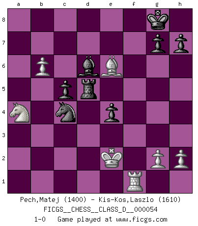 Last move : 1-0 2008 April 15 4:48:6 [Event "FICGS__CHESS__CLASS_D__000054"] [Site "FICGS"] [Date "2007.07.27"] [Round "1"] [White "Pech,Matej"] [Black "Kis-Kos,Laszlo"] [Result "1-0"] [WhiteElo "1400"] [BlackElo "1610"] 1.e4 c5 2.Nf3 d6 3.d4 cxd4 4.Nxd4 Nf6 5.Nc3 a6 6.Be3 e5 7.Nb3 Be6 8.f3 Nbd7 9.Qd2 b5 10.a4 b4 11.Nd5 Bxd5 12.exd5 Nb6 13.Bxb6 Qxb6 14.a5 Qb7 15.Bc4 Be7 16.Ra4 Rb8 17.Nc1 Bd8 18.b3 O-O 19.Na2 Nd7 20.Kf1 Nc5 21.Rxb4 Bxa5 22.Rxb7 Bxd2 23.Rxb8 Rxb8 24.Ke2 Bg5 25.b4 Nd7 26.Bxa6 f5 27.c4 Ra8 28.b5 e4 29.fxe4 fxe4 30.Rf1 Nb6 31.Nc3 Re8 32.c5 dxc5 33.Bb7 Nc4 34.Bc6 Re5 35.Na4 Be7 36.b6 Bd6 37.Bd7 Rxd5 38.Be6+ 1-0 Sicilian : Najdorf, Byrne (English) attack Kingside Castling by player Black (move 18) Player White won this chess game. Follow this game move after move (download)What is the difference between chess and football? Everybody understands football, but nobody plays it. Everybody plays chess, but nobody understands it. Everything is relative. (Vladimir Kramnik) Ohne ihre Erfolge schmälern zu wollen würde ich sagen Petrosian, Spassky und Karpov verdanken ihre Siege ihren Trainern - Boleslavsky, Bondarevsky und Furman. (Mikhail Moiseyevich Botvinik) El ganador de una partida es aquel jugador que hace el penúltimo error. (Savielly Tartakover) Aucun coup ne doit être joué sans but. (Pedro Damiano) Quotation,n.: The act of repeating erroneously the words of another. The words erroneously repeated. (Ambrose Bierce, The Devil's Dictionary)