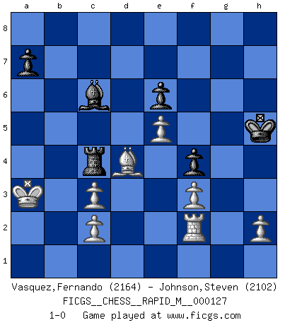 Last move : 1-0 2022 June 21 13:0:26 [Event "FICGS__CHESS__RAPID_M__000127"] [Site "FICGS"] [Date "2022.01.19"] [Round "1"] [White "Vasquez,Fernando"] [Black "Johnson,Steven"] [Result "1-0"] [WhiteElo "2164"] [BlackElo "2102"] 1.e4 c6 2.d4 d5 3.e5 Bf5 4.Nf3 e6 5.Be2 Ne7 6.O-O Ng6 7.Nc3 Be7 8.Ne1 h5 9.Bxh5 c5 10.g4 Rxh5 11.gxh5 cxd4 12.hxg6 dxc3 13.gxf7+ Kxf7 14.bxc3 Nc6 15.Rb1 b6 16.Nd3 Qh8 17.f3 Qh4 18.Be3 Na5 19.Kh1 Nc4 20.Bd4 Na3 21.Rb3 Rh8 22.Rf2 g5 23.Nb4 Nc4 24.Nc6 Ke8 25.Nxe7 Kxe7 26.Rb4 Ke8 27.Rxc4 dxc4 28.Qe2 Bh3 29.Qxc4 Qf4 30.Qc8+ Kf7 31.Qb7+ Kg6 32.Qe4+ Kh6 33.Re2 Rf8 34.Qxf4 gxf4 35.Kg1 Rc8 36.Kf2 Bf5 37.a4 Rc4 38.a5 bxa5 39.Ke1 a4 40.Kd1 a3 41.Kc1 Bg6 42.Kb1 Be8 43.Ka2 Bc6 44.Kxa3 Kh5 45.Rf2 1-0 This chess game has been lost on time (started : 2022.01.19 16:39:37) Caro-Kann : Advance variation Kingside Castling by player White (move 6) Player White won this chess game. Follow this game move after move (download)During a Chess competition a Chessmaster should be a combination of a beast of prey and a monk. (Alexander Alekhine) Smyslow ist ein Beweis dafür, dass ich noch zehn Jahre spielen kann! [der 75 jährige über den 85 jährigen] (Viktor Kortschnoi) El Ajedrez es de 30 a 40 por ciento psicología. Uno no cuenta con esto cuando se juega contra una computadora. No lo puedo confundir. (Judith Polgar) Les Echecs représentent une sphère d'idées créatrices basée sur la volonté des deux protagonistes. (Smyslov) If you don't practice you don't deserve to win. (Andre Agassi)