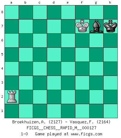 Last move : 1-0 2022 August 17 10:1:28 [Event "FICGS__CHESS__RAPID_M__000127"] [Site "FICGS"] [Date "2022.01.19"] [Round "1"] [White "Broekhuizen,A. T. S."] [Black "Vasquez,Fernando"] [Result "1-0"] [WhiteElo "2127"] [BlackElo "2164"] 1.e4 e5 2.Nf3 Nf6 3.Nxe5 d6 4.Nf3 Nxe4 5.d4 d5 6.Bd3 Nc6 7.O-O Be7 8.c4 Nb4 9.Be2 O-O 10.Nc3 Be6 11.Ne5 c5 12.Nxe4 dxe4 13.d5 Bc8 14.a3 Na6 15.f3 Bd6 16.f4 Qc7 17.Bd2 f6 18.Ng4 f5 19.Ne5 Nb8 20.Bc3 Nd7 21.Nxd7 Bxd7 22.Qd2 Rae8 23.g3 b6 24.Kh1 a6 25.Qe3 b5 26.b3 Rb8 27.Rg1 Rfe8 28.Raf1 Re7 29.Qd2 Qb7 30.h3 Qb6 31.Rc1 Bc7 32.Rg2 Qh6 33.b4 Qxh3+ 34.Kg1 cxb4 35.Bxb4 bxc4 36.Bc5 Bd8 37.d6 Re8 38.Qd5+ Re6 39.Bf2 Qh6 40.Bxc4 Qf6 41.Bd4 Qf8 42.Qe5 Qf7 43.Bxe6 Bxe6 44.d7 Rb7 45.Rb2 Rxd7 46.Rc6 Qg6 47.Kf2 Kf7 48.Rb8 Qh6 49.Kg2 Qf6 50.Rxe6 Qxe5 51.Rxe5 Rxd4 52.Rxf5+ Bf6 53.g4 Kg6 54.Rb3 Ra4 55.Kf1 h6 56.Ke2 Be7 57.Re5 Bxa3 58.Rb7 a5 59.Re6+ Kh7 60.Rc6 Rd4 61.R6c7 Bf8 62.f5 Rd8 63.f6 a4 64.Rf7 Kg8 65.fxg7 Ba3 66.Ke3 Re8 67.Rfc7 Kh7 68.Rc6 Kg8 69.Kf4 e3 70.Rxh6 Re7 71.Rxe7 Bxe7 72.Rc6 Kxg7 73.Kxe3 a3 74.Kf4 Kf7 75.g5 Bf8 76.g6+ Kg7 77.Kf5 a2 78.Ra6 Be7 79.Rxa2 Bb4 80.Ra7+ Kg8 81.g7 Kh7 82.Kf6 Bc3+ 83.Kf7 Bxg7 84.Ra2 1-0 Petrov : Classical attack Kingside Castling by player White (move 7) Kingside Castling by player Black (move 9) 10 pieces endgame at move 70 : White KRRPP , Black KRBPP WHITE : King + 2 Rooks 2 Pawns BLACK : King + 1 Rook 1 Bishop 2 Pawns 9 pieces endgame at move 71 : White KRRPP , Black KBPP WHITE : King + 2 Rooks 2 Pawns BLACK : King + 1 Bishop 2 Pawns 8 pieces endgame at move 71 : White KRPP , Black KBPP WHITE : King + 1 Rook 2 Pawns BLACK : King + 1 Bishop 2 Pawns 7 pieces endgame at move 72 : White KRP , Black KBPP WHITE : King + 1 Rook 1 Pawn BLACK : King + 1 Bishop 2 Pawns 6 pieces endgame at move 73 : White KRP , Black KBP WHITE : King + 1 Rook 1 Pawn BLACK : King + 1 Bishop 1 Pawn 5 pieces endgame at move 79 : White KRP , Black KB WHITE : King + 1 Rook 1 Pawn BLACK : King + 1 Bishop 4 pieces endgame at move 83 : White KR , Black KB WHITE : King + 1 Rook BLACK : King + 1 Bishop Player White won this chess game. Follow this game move after move (download)The winner of the game is the player who makes the next-to-last mistake. (Savielly Tartakover) Mit sehr nachdenklichem Gesicht schreitet Bobby durch den Turniersaal. Was ist passiert?, fragt Lombardy. Ich stehe schlecht, antwortet Fischer. Lombardy: Dann biete doch einfach Remis an. Fischer: So schlecht stehe ich nun auch wieder nicht! (Robert James Fischer) Un sacrificio se refuta mucho mejor al aceptarlo. (Wilhelm Steinitz) Les Echecs ont trois composantes : le temps, l'espace et le matériel en dernier. (Mikhail Tal) There are two kinds of tragedy in this world, one is not getting what you want and the other is getting. (Lord of war)
