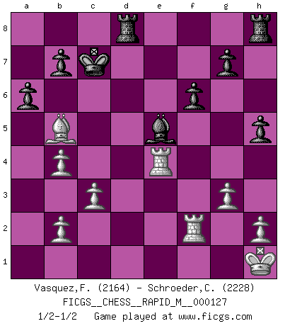Last move : 1/2-1/2 2022 March 22 22:34:49 [Event "FICGS__CHESS__RAPID_M__000127"] [Site "FICGS"] [Date "2022.01.19"] [Round "1"] [White "Vasquez,Fernando"] [Black "Schroeder,Christoph"] [Result "1/2-1/2"] [WhiteElo "2164"] [BlackElo "2228"] 1.e4 c5 2.c3 d5 3.exd5 Qxd5 4.d4 Bf5 5.Na3 Nc6 6.Be3 cxd4 7.Nb5 O-O-O 8.Nxd4 Nf6 9.Ngf3 Ng4 10.Qb3 Nxe3 11.fxe3 Nxd4 12.exd4 Qe4+ 13.Kf2 f6 14.Re1 Qc6 15.Bb5 Qc7 16.Rhf1 e5 17.Kg1 exd4 18.Nxd4 Bg6 19.Ne6 Bf7 20.Nxc7 Bxb3 21.axb3 Bc5+ 22.Kh1 Kxc7 23.b4 Bd6 24.g3 Be5 25.Rf2 h5 26.Re4 a6 1/2-1/2 Sicilian : Alapin's variation (2.c3) Queenside Castling by player Black (move 7) This chess game ended in a draw. Follow this game move after move (download)At this time Fischer is simply a level above all the best Chessplayers in the world. (John Jacobs) Dass jemand wie Surab Asmaiparaschwili, der selbst Elopunkte gekauft hat , Vize-Präsident der Fide werden konnte, sagt schon einges über den Zustand dieser Organisation aus. (Joel Lautier) Todos los Maestros de Ajedrez fueron un día unos principiantes. (Chernev) L'ordinateur a tué l'originalité. Il n'y a plus guère d'aventures sur l'échiquier. (Jacob Murray) Strategy without tactics is the slowest route to victory. Tactics without strategy is the noise before defeat. (Sun Tzu)