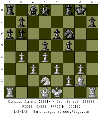 Last move : 1/2-1/2 2022 January 19 21:48:58 [Event "FICGS__CHESS__RAPID_M__000127"] [Site "FICGS"] [Date "2022.01.19"] [Round "1"] [White "Cirulis,Ilmars"] [Black "Ozen,Bahadir"] [Result "1/2-1/2"] [WhiteElo "2261"] [BlackElo "2369"] 1.d4 d5 2.Nc3 Nf6 3.Bf4 e6 4.Nb5 Bb4+ 5.c3 Ba5 6.Nf3 a6 7.Na3 Nbd7 8.e3 O-O 9.Nb1 Nh5 10.Bg5 f6 11.Bh4 g5 12.Bg3 f5 13.a4 Nxg3 14.hxg3 g4 15.b4 Bb6 16.a5 gxf3 17.axb6 fxg2 18.Bxg2 cxb6 19.Nd2 Nf6 1/2-1/2 Queen's pawn : Chigorin variation Kingside Castling by player Black (move 8) This chess game ended in a draw. Follow this game move after move (download)A sacrifice is best refuted by accepting it. (Wilhelm Steinitz) Der Umstand, daß uns eine 7 Stunden Zeitkontrolle ermöglicht eine großartige, tiefe Partie zu spielen, ist für die Massenmedien nicht weiter von Bedeutung. (Alexej Shirov) Hay jugadores fuertes y personas amables y yo soy un jugador fuerte. (Bobby Fischer) Ce qui est bien, c'est d'avoir tout un tas de pièces en prise : l'adversaire ne peut en prendre qu'une à la fois. Cité par Thierry Audin. Mandala - that's it! 16x16 squares as multiple of the four and the eight because of the Four Noble Truths and the Noble Eightfold Path. (Heinz-Georg Lehnhoff about Big Chess)