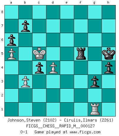 Last move : 0-1 2022 May 24 23:1:10 [Event "FICGS__CHESS__RAPID_M__000127"] [Site "FICGS"] [Date "2022.01.19"] [Round "1"] [White "Johnson,Steven"] [Black "Cirulis,Ilmars"] [Result "0-1"] [WhiteElo "2102"] [BlackElo "2261"] 1.d4 d5 2.Nc3 Nf6 3.Bf4 a6 4.e3 e6 5.g4 Bb4 6.Nge2 O-O 7.a3 Be7 8.g5 Nh5 9.h4 Nxf4 10.Nxf4 c5 11.Bd3 f5 12.gxf6 Rxf6 13.Rg1 Rh6 14.Qf3 cxd4 15.exd4 Nc6 16.O-O-O Kh8 17.Nce2 Bxh4 18.c3 Qf6 19.Qe3 Bd7 20.Rg2 Rf8 21.Bc2 Na5 22.b3 Bb5 23.Kb2 Bxe2 24.Nxe2 Bxf2 25.Qd2 Qh4 26.Rf1 R8f6 27.Ng1 Bxg1 28.Rfxg1 Rf7 29.Rg5 Nc6 30.R1g2 Ne7 31.Qe3 Rhf6 32.Re5 Rf3 33.Qg1 g6 34.Rxe6 Qf4 35.a4 Kg7 36.Qh2 Qxh2 37.Rxh2 Nf5 38.a5 Rc7 39.Bxf5 Rxf5 40.Rh3 h5 41.Ka3 Kh6 42.Rd6 R5f7 43.Kb4 Rcd7 44.Re6 Rf4 45.Rg3 Rg7 46.Rd3 h4 47.Kc5 Rf5 48.Kb4 Kh5 49.Re8 g5 50.Rh8+ Kg6 51.c4 Rh7 52.Rxh7 Kxh7 53.Rh3 Kg6 54.Rh1 Kh5 55.Re1 g4 56.Kc5 g3 57.Rg1 dxc4 0-1 Queen's pawn : Chigorin variation Kingside Castling by player Black (move 6) Queenside Castling by player White (move 16) Player Black won this chess game. Follow this game move after move (download)Who is your opponent tonight, tonight I am playing against the Black pieces. (Akiba Rubinstein) Schach wird sich dank seiner hohen kulturellen Tradition immer durchsetzen. In näherer Zukunft womöglich sogar als Gegenreaktion auf die maßlose Reizüberflutung im Freizeit- und Spielbereich. (Garry Kasparov) En el Ajedrez, tal como en la vida, las bendiciones de hoy pueden ser el veneno del mañana. (Assaic) 'L'échange des dames est un coup dur pour les deux adversaires...' Un journaliste lors d'une partie du match Spassky-Fischer It's only after you lost everything, Tyler says, that you're free to do anything. (Chuck Palahniuk, Fight Club)