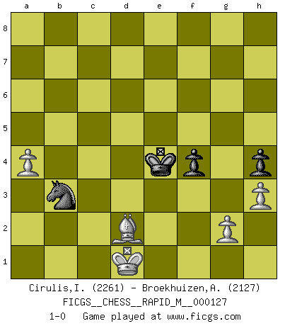 Last move : 1-0 2022 April 30 15:30:16 [Event "FICGS__CHESS__RAPID_M__000127"] [Site "FICGS"] [Date "2022.01.19"] [Round "1"] [White "Cirulis,Ilmars"] [Black "Broekhuizen,A. T. S."] [Result "1-0"] [WhiteElo "2261"] [BlackElo "2127"] 1.d4 Nf6 2.c4 e6 3.Nf3 Bb4+ 4.Nbd2 b6 5.a3 Bxd2+ 6.Bxd2 Bb7 7.e3 d6 8.Be2 a5 9.O-O O-O 10.b3 Nbd7 11.Bc3 c5 12.dxc5 Ne4 13.Bb2 bxc5 14.Bd3 f5 15.Nd2 Nef6 16.Bc2 Rf7 17.Qe2 Nf8 18.f3 g5 19.e4 Nh5 20.Rf2 f4 21.e5 d5 22.cxd5 exd5 23.e6 Re7 24.Bf5 d4 25.Rc1 Rc8 26.Qd3 Ng7 27.Re2 Rc6 28.Re5 Qc7 29.Rd5 Ba6 30.Qb1 Nxf5 31.Qxf5 Rcxe6 32.Ne4 Re5 33.Rdxc5 Qxc5 34.Rxc5 Rxf5 35.Rxf5 Ne6 36.Rxa5 Bb7 37.Re5 Bxe4 38.Rxe4 d3 39.Kf1 Rd7 40.Bc3 Kf7 41.Ke1 Nc5 42.Re5 Nxb3 43.Rxg5 d2+ 44.Kd1 Rd3 45.Bb4 Ke6 46.Rg8 Re3 47.Re8+ Kd5 48.Re4 h5 49.a4 h4 50.h3 Rxe4 51.fxe4+ Kxe4 52.Bxd2 1-0 Bogo-Indian defense, Gruenfeld variation Kingside Castling by player White (move 9) Kingside Castling by player Black (move 9) 10 pieces endgame at move 51 : White KBPPP , Black KNPPP WHITE : King + 1 Bishop 3 Pawns BLACK : King + 1 Knight 3 Pawns 9 pieces endgame at move 52 : White KBPPP , Black KNPP WHITE : King + 1 Bishop 3 Pawns BLACK : King + 1 Knight 2 Pawns Player White won this chess game. Follow this game move after move (download)A big shock; the best chess player in history has passed away. (Lajos Portisch, about Bobby Fischer's death) Ja, ich habe einmal eine Blitzpartie gespielt, es war in einem Zug, 1929. --im Interview 1989 (Mikhail Moiseyevich Botvinik) El Ajedrez te enseña a controlarl la excitación inicial que sientes cuando vez algo que parece bueno y te enseña a pensar objetivamente cuando te encuentras en problemas. (Stanley Kubrick) Les échecs, c'est l'imagination. (David Bronstein) All politicians must be presumed guilty until they are proven innocent. (Dinesh De Silva)