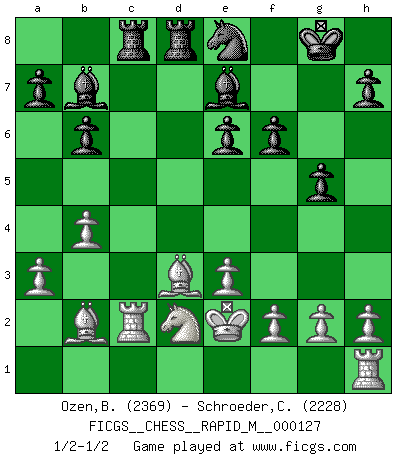 Last move : 1/2-1/2 2022 January 20 19:26:33 [Event "FICGS__CHESS__RAPID_M__000127"] [Site "FICGS"] [Date "2022.01.19"] [Round "1"] [White "Ozen,Bahadir"] [Black "Schroeder,Christoph"] [Result "1/2-1/2"] [WhiteElo "2369"] [BlackElo "2228"] 1.d4 Nf6 2.c4 e6 3.Nf3 d5 4.Nc3 Be7 5.Bf4 O-O 6.e3 b6 7.cxd5 Nxd5 8.Nxd5 Qxd5 9.a3 c5 10.dxc5 Qxc5 11.Rc1 Qa5+ 12.Qd2 Qxd2+ 13.Nxd2 Na6 14.Bb5 Bb7 15.Ke2 g5 16.Be5 Rac8 17.b4 Rfd8 18.Bd3 f6 19.Bb2 Nc7 20.Rc2 Ne8 1/2-1/2 Queen's pawn game Kingside Castling by player Black (move 5) This chess game ended in a draw. Follow this game move after move (download)Winning isn't everything... but losing is nothing. (Mednis) Du weisst es gibt ein Problem mit Computern und Fernschach, wenn jeder eine Rating von 2450 hat. (John Christen Knudsen) El Ajedrez no es como la vida... ¡tiene reglas!. (Mark Pasternak) Mais l'homme est une créature légère et illogique : semblable au joueur d'échecs, il n'aime que le processus du but à atteindre, non le but lui-même. (Dostoïevsky) Always be a first-rate version of yourself, instead of a second-rate version of somebody else. (Judy Garland)