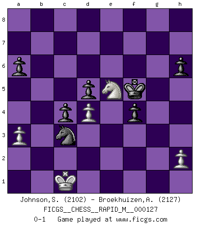 Last move : 0-1 2022 May 24 23:20:14 [Event "FICGS__CHESS__RAPID_M__000127"] [Site "FICGS"] [Date "2022.01.19"] [Round "1"] [White "Johnson,Steven"] [Black "Broekhuizen,A. T. S."] [Result "0-1"] [WhiteElo "2102"] [BlackElo "2127"] 1.d4 Nf6 2.Nc3 d5 3.Bf4 a6 4.e3 e6 5.a3 c5 6.Nf3 b5 7.Be2 Bb7 8.O-O c4 9.b3 Nbd7 10.Ne5 Nxe5 11.Bxe5 Be7 12.bxc4 bxc4 13.f4 O-O 14.f5 Nd7 15.Bg3 Bg5 16.Rb1 Bxe3+ 17.Kh1 Bc6 18.fxe6 fxe6 19.Bg4 Rxf1+ 20.Qxf1 Nf8 21.Ne2 Qf6 22.Qxf6 gxf6 23.Bf4 Bxf4 24.Nxf4 Kf7 25.Rb6 Bd7 26.Kg1 f5 27.Bf3 Ke7 28.c3 Kd8 29.Kf2 Kc7 30.Rb1 Bc6 31.Bd1 Kd6 32.g3 Nd7 33.Nh5 Ra7 34.Ke3 Rb7 35.Rxb7 Bxb7 36.Bc2 h6 37.Nf4 Bc6 38.Ng6 Nb6 39.g4 Ba4 40.Bxa4 Nxa4 41.gxf5 exf5 42.Kd2 Nb6 43.Nh4 Ke6 44.Ke3 Na4 45.Kd2 f4 46.Nf3 Kf5 47.Ne5 Nc5 48.Kc2 Ne4 49.Kc1 Nxc3 0-1 Queen's pawn game Kingside Castling by player White (move 8) Kingside Castling by player Black (move 13) Player Black won this chess game. Follow this game move after move (download)Robert Fischer is a law unto himself. (Larry Evans) Ich suche im Schach immer etwas Eigenes. Riskantes Spiel im Stile schachlicher Musketiere ist nicht meine Sache, auch wenn es vielen Freunden scharfer Wendungen gefällt. (Anatoly Karpov) Si yo gano un torneo, yo lo gano por mí mismo. Yo hago las jugadas. Nadie me ayuda. (Bobby Fischer) La victoire dans une partie d'Echecs appartient la plupart du temps à celui qui voit un peu plus loin que l'adversaire. (Lasker) Luck never made a man wise. (Seneca, Letters to Lucilius)