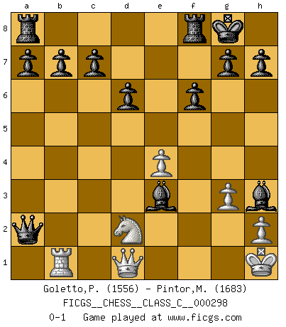 Last move : 0-1 2022 May 23 3:49:2 [Event "FICGS__CHESS__CLASS_C__000298"] [Site "FICGS"] [Date "2022.01.19"] [Round "1"] [White "Goletto,Piero Giuseppe"] [Black "Pintor,Manuel"] [Result "0-1"] [WhiteElo "1556"] [BlackElo "1683"] 1.e4 e5 2.Nf3 Nc6 3.Bb5 Bc5 4.d4 exd4 5.c3 Qf6 6.O-O Nge7 7.cxd4 Nxd4 8.Nfd2 Nxb5 9.Nc3 Nxc3 10.bxc3 d6 11.Nb3 Qxc3 12.Bg5 f6 13.Bf4 Bb6 14.Rc1 Qb4 15.Nd2 O-O 16.a3 Qd4 17.Rc4 Qb2 18.Rc1 Ng6 19.Rc4 Nxf4 20.g3 Nh3+ 21.Kh1 Nxf2+ 22.Rxf2 Bxf2 23.Rc1 Bh3 24.Rb1 Qxa3 25.Nc4 Qa2 26.Nd2 Be3 0-1 This chess game has been lost on time (started : 2022.01.19 17:59:4) Ruy Lopez : Classical (Cordel) defense Kingside Castling by player White (move 6) Kingside Castling by player Black (move 15) Player Black won this chess game. Follow this game move after move (download)Bobby just drops the pieces and they fall on the right squares. (Miguel Najdorf) Frage: Was machen Sie mit den Preisen? Anwort: Ich habe Angst, dass meine Freundin davon neue Kleider kauft. (Loek van Wely) Aunque la mayoría de la gente disfruta observar las partidas de los grandes Maestros de ataque, algunos de los jugadores mas notables en la historia han sido los jugadores silenciosos posicionales. Lentamente ellos te aplastan despojandote de tu espacio, congestionando tus piezas y dejandote virtualmente sin nada que hacer. (Yasser Seirawan) Mais n'est-ce pas déjà le limiter injurieusement que d'appeler les échecs un jeu? N'est-ce pas aussi une science, un art, ou quelque chose qui, comme le cercueil de Mahomet entre ciel et terre, est suspendu entre l'un et l'autre, et qui réunit un nombre incroyable de contraires ? (Stefan Zweig) Computers have lots of memory but no imagination. (Anonymous)