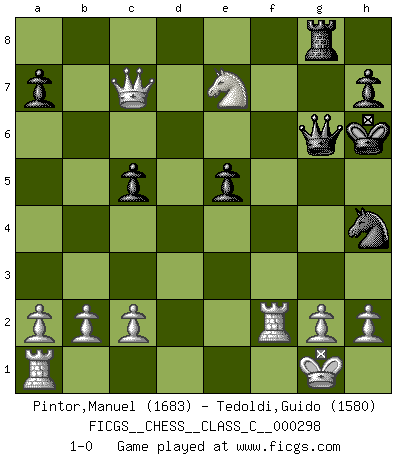 Last move : 1-0 2022 March 26 7:23:1 [Event "FICGS__CHESS__CLASS_C__000298"] [Site "FICGS"] [Date "2022.01.19"] [Round "1"] [White "Pintor,Manuel"] [Black "Tedoldi,Guido"] [Result "1-0"] [WhiteElo "1683"] [BlackElo "1580"] 1.e4 c5 2.f4 Nc6 3.Nf3 d6 4.Bc4 e6 5.Nc3 Nge7 6.O-O g6 7.d4 Qd7 8.f5 gxf5 9.exf5 Nxf5 10.d5 Ncd4 11.dxe6 fxe6 12.Ng5 Qg7 13.Nb5 Nxb5 14.Bxb5+ Bd7 15.Nxe6 Qg6 16.Nc7+ Kd8 17.Bxd7 Kxd7 18.Nxa8 Bg7 19.Qd5 Be5 20.Qxb7+ Ke6 21.Nc7+ Kf6 22.Nd5+ Ke6 23.Bf4 Rg8 24.Nc7+ Kf6 25.Bxe5+ dxe5 26.Nd5+ Kg5 27.Qc7 Kh6 28.Rf2 Nh4 29.Ne7 1-0 Sicilian : Grand Prix attack Kingside Castling by player White (move 6) Player White won this chess game. Follow this game move after move (download)Whoever sees no other aim in the game than that of giving checkmate to one's opponent will never become a good Chess player. (Euwe) Die Leute spielen gegen mich seit 15 Jahren unter Ihren Möglichkeiten. (Robert James Fischer) Si no le temes a Spassky, entonces elimino el elemento del dinero. (Jim Slater) Le moment que je préfère le plus dans une rencontre, c'est celui où je sens que la personnalité de l'adversaire se brise. (Robert Fischer) He who laughs last probably does not get the joke. (Unknown)