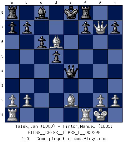 Last move : 1-0 2022 February 4 20:42:16 [Event "FICGS__CHESS__CLASS_C__000298"] [Site "FICGS"] [Date "2022.01.19"] [Round "1"] [White "Talek,Jan"] [Black "Pintor,Manuel"] [Result "1-0"] [WhiteElo "2000"] [BlackElo "1683"] 1.e4 e5 2.Nf3 Nc6 3.Bb5 Bc5 4.c3 Qf6 5.d4 exd4 6.e5 Nxe5 7.Qe2 dxc3 8.Nxc3 c6 9.Nxe5 Bxf2+ 10.Qxf2 Qxe5+ 11.Be2 d5 12.O-O Nf6 13.Bf4 Qe7 14.Qg3 Ne4 15.Nxe4 Qxe4 16.Qxg7 Rf8 17.Bd6 1-0 Ruy Lopez : Classical defense, 4.c3 Kingside Castling by player White (move 12) Player White won this chess game. Follow this game move after move (download)Any material change in a position must come about by mate, a capture, or a Pawn promotion. (Purdy) Ein guter Spieler hat immer Glück. (José Raúl Capablanca) Tu sabes, camarada Pachman, no disfruto el ser un Ministro, preferería jugar al Ajedrez como tu. (Che Guevara) Les écrivains ont utilisé les échecs pour analyser les côtés extrêmes de la nature humaine. Dans ce cadre, les échecs offrent un champ d'expérimentation idéal. Mais on pourrait faire la même chose avec la peinture. Et là, en vous référant à Van Gogh, vous ne tirerez pas de conclusion définitive sur les peintres. (Gary Kasparov) It is not enough to be a good player... you must also play well. (Siegbert Tarrasch)