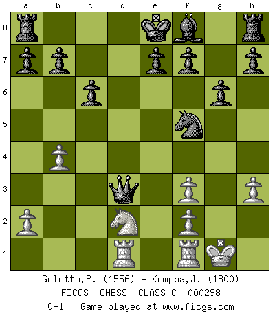 Last move : 0-1 2022 April 22 19:42:32 [Event "FICGS__CHESS__CLASS_C__000298"] [Site "FICGS"] [Date "2022.01.19"] [Round "1"] [White "Goletto,Piero Giuseppe"] [Black "Komppa,Jormaveikko"] [Result "0-1"] [WhiteElo "1556"] [BlackElo "1800"] 1.e4 c6 2.Nf3 d5 3.Nc3 dxe4 4.Bd3 exd3 5.cxd3 Bg4 6.h3 Bxf3 7.gxf3 Nh6 8.b4 Nd7 9.O-O g6 10.Ne4 Ne5 11.d4 Qxd4 12.Rb1 Nd3 13.Bb2 Nxb2 14.d3 Nxd1 15.Rbxd1 Nf5 16.Nd2 Qxd3 0-1 This chess game has been lost on time (started : 2022.01.19 17:59:4) Caro-Kann defense Kingside Castling by player White (move 9) Player Black won this chess game. Follow this game move after move (download)When your house is on fire, you can't be bothered with the neighbors. Or, as we say in Chess, if your King is under attack you don't worry about losing a Pawn on the Queen's side. (Gary Kasparov) Kritik überlasse ich den Spießern. Ich zeige nichts, wofür ich mich schämen muss. (Alexandra Kosteniuk) El pensamiento metódico es mas útil en el Ajedrez que la inspiración. (C. J. S. Purdy) En blitz, le Cavalier l'emporte sur le Fou. (Vlastimil Hort) Panic is a sudden desertion of us, an a going over to the enemy of our imagination. (Christian Nevell Bovee)