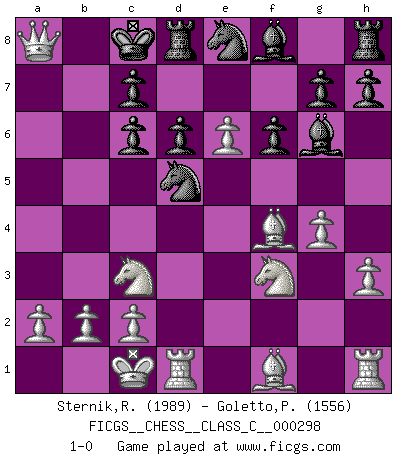 Last move : 1-0 2022 March 17 18:26:35 [Event "FICGS__CHESS__CLASS_C__000298"] [Site "FICGS"] [Date "2022.01.19"] [Round "1"] [White "Sternik,Ryszard"] [Black "Goletto,Piero Giuseppe"] [Result "1-0"] [WhiteElo "1989"] [BlackElo "1556"] 1.e4 e5 2.f4 exf4 3.Nf3 Nc6 4.d4 Nf6 5.Qe2 d6 6.Bxf4 Bg4 7.d5 Ne7 8.h3 Bh5 9.g4 Bg6 10.Nc3 Qd7 11.O-O-O O-O-O 12.e5 Ne8 13.Qe3 f6 14.e6 Qc6 15.dxc6 bxc6 16.Qxa7 Nd5 17.Qa8+ 1-0 King's knight's gambit Queenside Castling by player White (move 11) Queenside Castling by player Black (move 11) Player White won this chess game. Follow this game move after move (download)Bobby Fischer is the greatest Chess genius of all time ! (Alexander Kotov) Moralische Siege zählen nicht. (Savielly Grigorievitsch Tartakower) Tu cuerpo tiene que estar en óptima condición. Tu Ajedrez se deteriora como lo hace tu cuerpo. No puedes separar la mente y el cuerpo. (Bobby Fischer) Les Echecs ne sont pas pour les âmes timides. Ils requièrent un homme entier, qui ne s'arrête pas aveuglément à ce qui a été déjà établi, mais qui tente individuellement de sonder les profondeurs du jeu. (W. Steinitz) The Movers & Shakers of this world are those who play chess in the mornings and go to the disco in the evenings. (Dinesh De Silva)