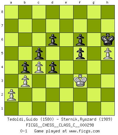 Last move : 0-1 2022 May 17 11:7:26 [Event "FICGS__CHESS__CLASS_C__000298"] [Site "FICGS"] [Date "2022.01.19"] [Round "1"] [White "Tedoldi,Guido"] [Black "Sternik,Ryszard"] [Result "0-1"] [WhiteElo "1580"] [BlackElo "1989"] 1.c4 Nf6 2.Nc3 e5 3.d3 Nc6 4.e4 Bc5 5.h3 h6 6.Nf3 O-O 7.Be2 d6 8.O-O a5 9.Bd2 Nd4 10.Nxd4 Bxd4 11.Be3 c6 12.Qd2 Be6 13.Bxd4 exd4 14.Nd1 Qb8 15.f4 b5 16.f5 Bd7 17.Rf3 bxc4 18.Nf2 Qb4 19.Qxb4 axb4 20.dxc4 c5 21.b3 Rfe8 22.h4 Nxe4 23.Nxe4 Rxe4 24.Bd3 Rxh4 25.Rf2 f6 26.Re1 Kf8 27.Rfe2 Rf4 28.Rf1 Rxf1+ 29.Kxf1 Re8 30.g4 Rxe2 31.Kxe2 g6 32.Kf3 h5 33.gxh5 Bxf5 34.Bxf5 gxf5 35.Kf4 Kg7 36.Kf3 Kh6 0-1 English Opening Kingside Castling by player Black (move 6) Kingside Castling by player White (move 8) Player Black won this chess game. Follow this game move after move (download)It is peculiar but a fact nevertheless, that gamblers in chess always have enthusiastic followers. (Botvinnik) Ich habe kein Problem mit Frauen, sondern nur mit dem Niveau ihres Schachspiels (Judith Polgar) En el tablero, la mentira e hipocresía no sobreviven mucho. (Emanuel Lasker) Fischer est le meilleur joueur du monde et Karpov n'est qu'un joueur de bistrot. (Garry Kasparov, agé de 16 ans) Are you threatening me, Master Jedi ? (Chancellor Palpatine in Star Wars ep.3)