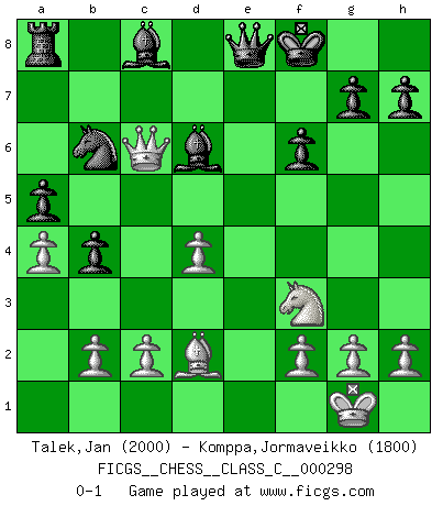 Last move : 0-1 2022 February 5 20:33:58 [Event "FICGS__CHESS__CLASS_C__000298"] [Site "FICGS"] [Date "2022.01.19"] [Round "1"] [White "Talek,Jan"] [Black "Komppa,Jormaveikko"] [Result "0-1"] [WhiteElo "2000"] [BlackElo "1800"] 1.e4 c6 2.d4 d5 3.Nc3 dxe4 4.Nxe4 Nf6 5.Nxf6+ exf6 6.Bc4 Bd6 7.Nf3 O-O 8.O-O Re8 9.Qd3 Nd7 10.Bd2 a5 11.Rfe1 Rxe1+ 12.Rxe1 b5 13.Bxf7+ Kxf7 14.a4 b4 15.Qc4+ Kf8 16.Qxc6 Nb6 17.Re8+ Qxe8 0-1 Caro-Kann : Forgacs variation Kingside Castling by player Black (move 7) Kingside Castling by player White (move 8) Player Black won this chess game. Follow this game move after move (download)The combination player thinks forward; he starts from the given position, and tries the forceful moves in his mind. (Emanuel Lasker) Mit sehr nachdenklichem Gesicht schreitet Bobby durch den Turniersaal. Was ist passiert?, fragt Lombardy. Ich stehe schlecht, antwortet Fischer. Lombardy: Dann biete doch einfach Remis an. Fischer: So schlecht stehe ich nun auch wieder nicht! (Robert James Fischer) Tu sabes, camarada Pachman, no disfruto el ser un Ministro, preferería jugar al Ajedrez como tu. (Che Guevara) J'apprécie les joueurs d'est-indienne, c'est grâce à eux que je nourris ma famille depuis tant d'années. (Petrosian) Life doesn't imitate art, it imitates bad television. (Woody Allen)