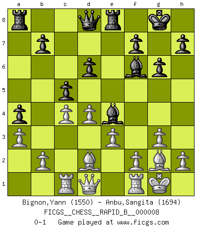 Last move : 0-1 2006 August 30 18:59:36 [Event "FICGS__CHESS__RAPID_B__000008"] [Site "FICGS"] [Date "2006.06.24"] [Round "1"] [White "Bignon,Yann"] [Black "Anbu,Sangita"] [Result "0-1"] [WhiteElo "1550"] [BlackElo "1694"] 1.d4 d6 2.c4 e5 3.e3 Nd7 4.Nc3 Ngf6 5.Nf3 g6 6.g3 Bg7 7.Bg2 O-O 8.O-O e4 9.Ng5 Re8 10.Ngxe4 Nxe4 11.Nxe4 Nf6 12.Nxf6+ Bxf6 13.Rb1 a5 14.Bd2 Bf5 15.Rc1 c6 16.a3 a4 17.Qf3 Be4 18.Qd1 c5 0-1 Old Indian defense Kingside Castling by player Black (move 7) Kingside Castling by player White (move 8) Player Black won this chess game. Follow this game move after move (download)Only sissies Castle. (Rob Sillars) Du weisst es gibt ein Problem mit Computern und Fernschach, wenn jeder eine Rating von 2450 hat. (John Christen Knudsen) El arma más poderosa en el Ajedrez, es tener la próxima movida. (David Bronstein) Mais l'homme est une créature légère et illogique : semblable au joueur d'échecs, il n'aime que le processus du but à atteindre, non le but lui-même. (Dostoïevsky) He who defends everything defends nothing. (Frederick the Great)