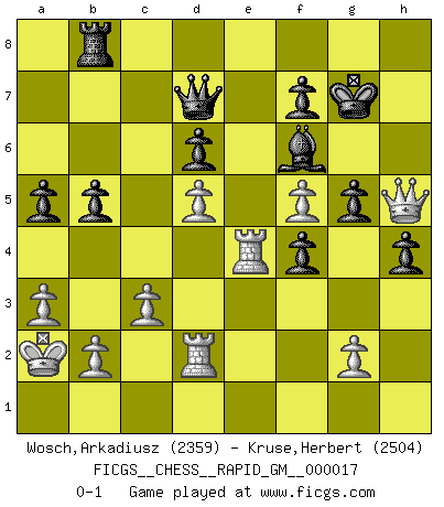 Last move : 0-1 2022 April 21 18:17:26 [Event "FICGS__CHESS__RAPID_GM__000017"] [Site "FICGS"] [Date "2022.01.20"] [Round "1"] [White "Wosch,Arkadiusz"] [Black "Kruse,Herbert"] [Result "0-1"] [WhiteElo "2359"] [BlackElo "2504"] 1.e4 c5 2.Nf3 d6 3.d4 cxd4 4.Nxd4 Nf6 5.Nc3 a6 6.Be3 e5 7.Nb3 Be6 8.f3 h5 9.Qd2 Nbd7 10.f4 Qc7 11.O-O-O b5 12.Kb1 Nb6 13.Bxb6 Qxb6 14.Bd3 Be7 15.h3 h4 16.Rhe1 Kf8 17.Bf1 Re8 18.a3 Bd7 19.Be2 Rh6 20.Rf1 Be6 21.Bf3 Kg8 22.Na2 exf4 23.Nb4 g5 24.Rfe1 Nd7 25.Nd5 Bxd5 26.exd5 Ne5 27.Nd4 Bf6 28.c3 Kf8 29.Qe2 Qc7 30.Bg4 Rb8 31.Nf5 Rg6 32.Qc2 Nxg4 33.hxg4 Be5 34.Re4 Rf6 35.Qe2 Rxf5 36.gxf5 Bf6 37.Rd2 a5 38.Qh5 Kg7 39.Ka2 Qd7 0-1 Sicilian : Najdorf, Byrne (English) attack Queenside Castling by player White (move 11) Player Black won this chess game. Follow this game move after move (download)It was clear to me that the vulnerable point of the American Grandmaster (Bobby Fischer) was in double-edged, hanging, irrational positions, where he often failed to find a win even in a won position. (Efim Geller) Fischer ist das größte Genie, das je vom Schachhimmel heruntergestiegen ist. (Mikhail Nekhemyevich Tal) El pensamiento metódico es mas útil en el Ajedrez que la inspiración. (C. J. S. Purdy) Des points faibles ou des trous dans la position de l'adversaire doivent être occupés par des pièces et non pas par des pions. (Siegbert Tarrasch) Memory is a crazy woman that hoards colored rags and throws away food. (Austin O'Malley)