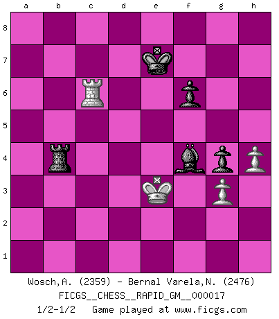 Last move : 1/2-1/2 2022 May 2 21:33:40 [Event "FICGS__CHESS__RAPID_GM__000017"] [Site "FICGS"] [Date "2022.01.20"] [Round "1"] [White "Wosch,Arkadiusz"] [Black "Bernal Varela,Nelson"] [Result "1/2-1/2"] [WhiteElo "2359"] [BlackElo "2476"] 1.e4 e6 2.d4 d5 3.Nc3 Nf6 4.Bg5 dxe4 5.Nxe4 Be7 6.Bxf6 gxf6 7.Nf3 f5 8.Nc3 a6 9.a3 Qd6 10.g3 Nc6 11.Ne2 h5 12.h4 e5 13.dxe5 Nxe5 14.Nxe5 Qxe5 15.Bg2 f4 16.Qd5 Qxb2 17.O-O fxg3 18.fxg3 Be6 19.Qxb7 Qxb7 20.Bxb7 Rd8 21.Bxa6 Rg8 22.Kf2 Bc5+ 23.Kg2 Rd2 24.Rfd1 Rxc2 25.Rac1 Rxc1 26.Rxc1 Bxa3 27.Rxc7 Bd6 28.Rc3 Rg4 29.Bb7 Rb4 30.Bf3 Bg4 31.Kf2 Ke7 32.Bxg4 hxg4 33.Ke3 Be5 34.Rc6 f6 35.Nf4 Bxf4+ 1/2-1/2 French : Burn variation Kingside Castling by player White (move 17) 10 pieces endgame at move 32 : White KRNPP , Black KRBPP WHITE : King + 1 Rook 1 Knight 2 Pawns BLACK : King + 1 Rook 1 Bishop 2 Pawns 9 pieces endgame at move 35 : White KRPP , Black KRBPP WHITE : King + 1 Rook 2 Pawns BLACK : King + 1 Rook 1 Bishop 2 Pawns This chess game ended in a draw. Follow this game move after move (download)The only thing Chess players have in common is Chess. (Lodewijk Prins) Ich hatte meine größten Erfolge, als ich 47 Jahre alt war. Kasparow war noch nicht mal 42 und hat das Schach schon im Stich gelassen. (Viktor Kortschnoi) Fischer deseaba darle a los Rusos una sopa de su propia medicina. (Larry Evans) Ce qui caractérise les parties de combat, c'est que si le défenseur a constamment de difficiles problèmes à résoudre, l'attaquant doit chercher sans relâche de nouvelles possibilités d'attaque. (Koblentz) Always be a first-rate version of yourself, instead of a second-rate version of somebody else. (Judy Garland)