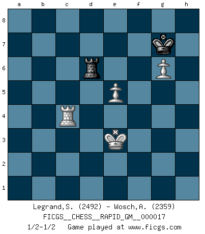 Last move : 1/2-1/2 2022 September 4 13:57:29 [Event "FICGS__CHESS__RAPID_GM__000017"] [Site "FICGS"] [Date "2022.01.20"] [Round "1"] [White "Legrand,Stephane"] [Black "Wosch,Arkadiusz"] [Result "1/2-1/2"] [WhiteElo "2492"] [BlackElo "2359"] 1.d4 Nf6 2.c4 e6 3.g3 d5 4.Bg2 Be7 5.Nf3 O-O 6.O-O dxc4 7.Qc2 a6 8.a4 Bd7 9.Qxc4 Bc6 10.Bg5 Nbd7 11.Nc3 h6 12.Bxf6 Nxf6 13.Rfd1 Re8 14.a5 Qd6 15.e3 Bf8 16.Qf1 Rad8 17.h4 Qb4 18.Qe2 Bxf3 19.Bxf3 c6 20.Ra4 Qe7 21.h5 Nd5 22.Qc2 Nf6 23.Kg2 Rd7 24.Rc4 Qd8 25.b4 Nd5 26.Rb1 Nf6 27.Rd1 Nd5 28.Qb3 Qg5 29.Ne4 Qd8 30.Rb1 f5 31.Nd2 Bd6 32.R4c1 Qe7 33.Rh1 Bxb4 34.Nc4 Bd6 35.Rb2 Bb8 36.Rhb1 Qg5 37.Qc2 R8e7 38.Rb3 Nf6 39.Rh1 Nd5 40.Rhb1 Nf6 41.Nb6 Rc7 42.Rh1 Ba7 43.Rc3 Ne4 44.Bxe4 fxe4 45.Nc4 Qd5 46.Rh4 Rc8 47.Qxe4 Rd8 48.Qxd5 Rxd5 49.f4 Rb5 50.Rh1 Bb8 51.g4 Bc7 52.Ra1 Rd7 53.Rc2 R7d5 54.Kf3 Kf7 55.Rg1 Kg8 56.Ne5 Bd8 57.Rh2 Bf6 58.g5 hxg5 59.h6 Kh7 60.fxg5 Bxe5 61.g6+ Kh8 62.hxg7+ Kxg7 63.Rh7+ Kg8 64.dxe5 Rxe5 65.e4 Rg5 66.Rxg5 Rxg5 67.Rxb7 Rxa5 68.Kf4 c5 69.Kg5 Ra1 70.Rb8+ Kg7 71.Rb7+ Kg8 72.Rc7 Rg1+ 73.Kf6 Rf1+ 74.Kxe6 Rc1 75.Kf6 Rf1+ 76.Ke5 Rc1 77.Ra7 c4 78.Rxa6 Kg7 79.Kd4 Re1 80.Re6 Rc1 81.Rc6 Rc2 82.Rxc4 Rd2+ 83.Ke3 Rd6 84.e5 1/2-1/2 Catalan : Closed, 5.Nf3 Kingside Castling by player Black (move 5) Kingside Castling by player White (move 6) 10 pieces endgame at move 67 : White KRPPP , Black KRPPP WHITE : King + 1 Rook 3 Pawns BLACK : King + 1 Rook 3 Pawns 9 pieces endgame at move 67 : White KRPP , Black KRPPP WHITE : King + 1 Rook 2 Pawns BLACK : King + 1 Rook 3 Pawns 8 pieces endgame at move 74 : White KRPP , Black KRPP WHITE : King + 1 Rook 2 Pawns BLACK : King + 1 Rook 2 Pawns 7 pieces endgame at move 78 : White KRPP , Black KRP WHITE : King + 1 Rook 2 Pawns BLACK : King + 1 Rook 1 Pawn 6 pieces endgame at move 82 : White KRPP , Black KR WHITE : King + 1 Rook 2 Pawns BLACK : King + 1 Rook This chess game ended in a draw. Follow this game move after move (download)The winner of the game is the player who makes the next-to-last mistake. (Savielly Tartakover) Der Bart als Geschlechtszeichen mitten im Gesicht ist obszön. Daher gefällt er den Weibern. [Zugegeben, kein Schachzitat, aber unglaublich originell] (Arthur Schopenhauer) El Ajedrez es la vida. (Bobby Fischer) Les Cavaliers se révèlent fort utiles dans les positions fermées. D'habitude, les Fous sont un peu plus forts que les Cavaliers dans les positions ouvertes. Qu'on le veuille ou non, il restera toujours des exceptions ! Luck is when opportunity knocks and you answer. (Anonymous)