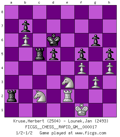 Last move : 1/2-1/2 2022 February 10 9:5:39 [Event "FICGS__CHESS__RAPID_GM__000017"] [Site "FICGS"] [Date "2022.01.20"] [Round "1"] [White "Kruse,Herbert"] [Black "Lounek,Jan"] [Result "1/2-1/2"] [WhiteElo "2504"] [BlackElo "2493"] 1.d4 d5 2.c4 c6 3.e3 Nf6 4.Nd2 Bf5 5.Ngf3 e6 6.Be2 h6 7.O-O Nbd7 8.Qb3 Qb6 9.a4 a5 10.Qxb6 Nxb6 11.Ne1 h5 12.f3 Be7 13.b3 Bb4 14.Ra2 c5 15.cxd5 Nfxd5 16.Bb5+ Ke7 17.e4 Nc3 18.Rc2 Bh7 19.dxc5 Nbd5 20.exd5 Bxc5+ 21.Kh1 Bxc2 22.Nxc2 Nxb5 23.axb5 exd5 24.Bb2 f6 25.Rd1 Rhc8 26.Nf1 a4 27.bxa4 Rxa4 28.Bd4 g6 29.Nfe3 Ke6 30.f4 Bd6 31.g3 Ra2 32.Rd2 Kf7 33.h4 f5 34.Kg1 Bc5 35.Bxc5 Rxc5 36.b6 Ke7 37.Re2 Kd7 38.Kf1 Kd6 1/2-1/2 QGD Slav defense Kingside Castling by player White (move 7) This chess game ended in a draw. Follow this game move after move (download)Winning isn't everything... but losing is nothing. (Mednis) Herr Iljumschinow ist ein etwas merkwürdiger Geschäftsmann: Er arbeitet zusammen mit Leuten wie Muammar al-Gaddafi; früher ist das Saddam Hussein gewesen. (Joel Lautier) Todo se encuentra en un estado de flujo y esto incluye al mundo del Ajedrez. (Mikhail Botvinnik) Je ne crois pas en la psychologie, je crois aux bons coups. (Robert Fischer) Only sick music makes money today. (Friedrich Nietzsche)