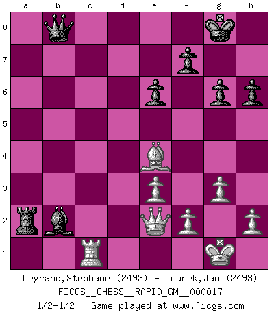 Last move : 1/2-1/2 2022 March 6 9:36:35 [Event "FICGS__CHESS__RAPID_GM__000017"] [Site "FICGS"] [Date "2022.01.20"] [Round "1"] [White "Legrand,Stephane"] [Black "Lounek,Jan"] [Result "1/2-1/2"] [WhiteElo "2492"] [BlackElo "2493"] 1.d4 d5 2.c4 c6 3.Nf3 Nf6 4.Nc3 e6 5.e3 Nbd7 6.Qc2 Bd6 7.Bd3 O-O 8.O-O dxc4 9.Bxc4 a6 10.a4 c5 11.dxc5 Bxc5 12.b3 b6 13.Ne4 Be7 14.Ng3 Bb7 15.Bb2 Qc7 16.Qe2 Rfd8 17.Rac1 Qb8 18.Rfd1 h6 19.Rd4 Nc5 20.Ne5 b5 21.axb5 axb5 22.Rxd8+ Qxd8 23.Rd1 Qc8 24.Bxb5 Nxb3 25.Rb1 Nc5 26.Rc1 Qb8 27.Nh5 Nce4 28.Nc6 Bxc6 29.Bxc6 Ra2 30.Nxf6+ Bxf6 31.Bxe4 Bxb2 32.g3 g6 1/2-1/2 QGD Slav : 4.Nc3 Kingside Castling by player Black (move 7) Kingside Castling by player White (move 8) This chess game ended in a draw. Follow this game move after move (download)Chess is life. (Bobby Fischer) Wenn Schach ein enormer Dschungel ist, der seine Myriaden von Geheimnissen nicht preisgeben will, dann sind Computer die Kettensägen einer gewaltigen ökologisch unsensiblen Nutzholzfirma. (Nigel Short) Los Peones son nacidos libres, y aún así, se encuentran encadenados por todos lados. (Rick Kennedy) Fischer est le meilleur joueur du monde et Karpov n'est qu'un joueur de bistrot. (Garry Kasparov, agé de 16 ans) May the force be with you. (Han Solo in Star Wars ep.4)
