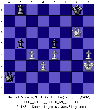 Last move : 1/2-1/2 2022 June 23 17:23:54 [Event "FICGS__CHESS__RAPID_GM__000017"] [Site "FICGS"] [Date "2022.01.20"] [Round "1"] [White "Bernal Varela,Nelson"] [Black "Legrand,Stephane"] [Result "1/2-1/2"] [WhiteElo "2476"] [BlackElo "2492"] 1.e4 c5 2.Nc3 Nc6 3.Nf3 e5 4.Bc4 Be7 5.d3 d6 6.Nd2 Nf6 7.Nf1 Bg4 8.f3 Be6 9.Ne3 O-O 10.a4 a6 11.O-O Rb8 12.g3 Qd7 13.Bd2 Bd8 14.Kh1 Kh8 15.Be1 Re8 16.g4 Ng8 17.h4 Nge7 18.Qd2 Ba5 19.Qh2 h6 20.Bg3 Bxc3 21.Bxe6 Qxe6 22.bxc3 b5 23.axb5 axb5 24.f4 exf4 25.Bxf4 Ne5 26.Bxe5 dxe5 27.g5 h5 28.Qf2 c4 29.Kh2 cxd3 30.cxd3 Kg8 31.Ra6 Qxa6 32.Qxf7+ Kh8 33.Qxh5+ Kg8 34.Qf7+ Kh8 35.Rf6 Qa3 36.Qh5+ Kg8 37.Qf7+ Kh8 38.Ng4 Rf8 39.Qh5+ Kg8 40.g6 Qa2+ 41.Kh3 Rxf6 42.Nxf6+ gxf6 43.c4 Nxg6 44.Qxg6+ Kh8 45.Qxf6+ Kh7 46.Qf7+ Kh8 47.Qf6+ Kh7 48.Qf7+ Kh8 49.Qh5+ Kg8 50.Qg6+ Kh8 51.Qh6+ Kg8 52.Qg6+ Kh8 53.Qh6+ Kg8 54.Qg6+ 1/2-1/2 Sicilian : Closed, 2...Nc6 Kingside Castling by player Black (move 9) Kingside Castling by player White (move 11) This chess game ended in a draw. Follow this game move after move (download)I play correspondence chess because it is both art and science while chess is art only. (A player at FICGS) Wie ich sie so einen nach dem anderen nieder mähte wurde meine Überlegenheit offensichtlich. (José Raúl Capablanca) Cuando le juegas a Fischer, no es una cuestion de si vas a ganar o perder. Es una cuestion de si vas a sobrevivir. (Boris Spassky) D'abord les bases : Jouez et étudiez, puis étudiez et jouez, ensuite jouez et étudiez, puis étudiez et jouez. Deuxièmement : Donnez toujours le meilleur de vous-même ! (Ken Smith) See no evil, hear no evil, speak no evil. (The 3 monkeys)