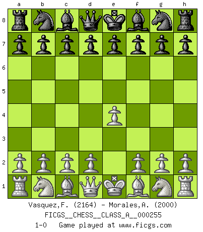 Last move : 1-0 2022 March 2 12:13:24 [Event "FICGS__CHESS__CLASS_A__000255"] [Site "FICGS"] [Date "2022.01.20"] [Round "1"] [White "Vasquez,Fernando"] [Black "Morales,Alberto"] [Result "1-0"] [WhiteElo "2164"] [BlackElo "2000"] 1.e4 1-0 This chess game has been lost on time (started : 2022.01.20 21:26:37) King's pawn Opening Player White won this chess game. Follow this game move after move (download)You must take your opponent into a deep dark forest where 2+2=5, and the path leading out is only wide enough for one. (Mikhail Tal) Das Schach hält seine Meister in eigenen Banden, Fesseln; auf vielerlei Weise formt es ihren Geist, so dass die innere Freiheit selbst des Stärksten beeinflusst wird. (Albert Einstein) Solo puedes ser bueno en el Ajedrez si amas al juego. (Bobby Fischer) Il n'y a pas de prix trop élevé au scalp de l'ennemi. (Koblentz) All art requires courage. (Anne Tucker)
