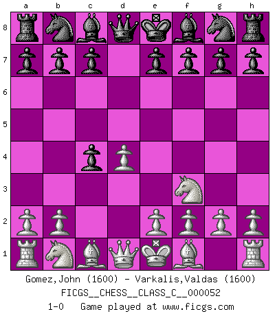 Last move : 1-0 2007 September 11 19:54:53 [Event "FICGS__CHESS__CLASS_C__000052"] [Site "FICGS"] [Date "2007.07.27"] [Round "1"] [White "Gomez,John"] [Black "Varkalis,Valdas"] [Result "1-0"] [WhiteElo "1600"] [BlackElo "1600"] 1.d4 d5 2.c4 dxc4 3.Nf3 1-0 This chess game has been lost on time (started : 2007.07.27 3:9:6) QGA : 3.Nf3 Player White won this chess game. Follow this game move after move (download)The blunders are all there on the board, waiting to be made. (Savielly Tartakover) Der zweitbeste Zug ist oft der einzig richtige. (Savielly Grigorievitsch Tartakower) El Ajedrez te enseña a controlarl la excitación inicial que sientes cuando vez algo que parece bueno y te enseña a pensar objetivamente cuando te encuentras en problemas. (Stanley Kubrick) Seul un grand joueur sait à quel point il joue faiblement. (Xavier Tartacover) If you don't practice you don't deserve to win. (Andre Agassi)