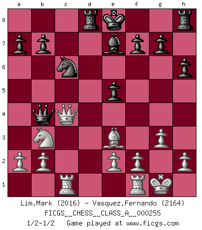 Last move : 1/2-1/2 2022 May 23 7:15:32 [Event "FICGS__CHESS__CLASS_A__000255"] [Site "FICGS"] [Date "2022.01.20"] [Round "1"] [White "Lim,Mark"] [Black "Vasquez,Fernando"] [Result "1/2-1/2"] [WhiteElo "2016"] [BlackElo "2164"] 1.d4 Nf6 2.Nf3 e6 3.g3 c5 4.Bg2 cxd4 5.Nxd4 d5 6.O-O e5 7.Nb3 Be6 8.c4 Nc6 9.cxd5 Nxd5 10.N1d2 h6 11.Ne4 Qb6 12.Nd6+ Bxd6 13.Bxd5 Bxd5 14.Qxd5 Rd8 15.Be3 Qb4 16.Rac1 Be7 17.Qc4 1/2-1/2 Queen's pawn game Kingside Castling by player White (move 6) This chess game ended in a draw. Follow this game move after move (download)Bobby Fischer is the greatest Chess genius of all time ! (Alexander Kotov) Ein Großmeister muß tausende Partien in seinem Kopf speichern, denn diese sind für Ihn, was die Worte der Muttersprache für gewöhnliche Leute sind, oder Noten für Musiker... (Garry Kasparov) Debes de llevar a tu oponente hacia un profundo y obscuro bosque donde 2+2=5, y el camino que conduce a la salida es suficientemente ancho para solamente uno. (Mikhail Tal) Le génie consiste à savoir transgresser les règles au moment opportun. (Teichmann) Waiting for chance ? Play in casinos. (FICGS proverb)