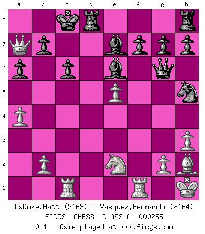 Last move : 0-1 2022 May 12 16:28:21 [Event "FICGS__CHESS__CLASS_A__000255"] [Site "FICGS"] [Date "2022.01.20"] [Round "1"] [White "LaDuke,Matt"] [Black "Vasquez,Fernando"] [Result "0-1"] [WhiteElo "2163"] [BlackElo "2164"] 1.e4 e5 2.Nf3 Nf6 3.Nxe5 d6 4.d4 dxe5 5.Bd3 Qxd4 6.O-O Be6 7.Nc3 Qd7 8.Qe2 Nc6 9.f4 exf4 10.Bxf4 Bc5+ 11.Kh1 O-O-O 12.a4 Nb4 13.Rac1 a6 14.h3 Nxd3 15.cxd3 Qxd3 16.Qe1 Nh5 17.Bh2 Bd6 18.e5 Bb4 19.Qf2 Qg6 20.Qa7 c6 21.Ne2 Be7 0-1 Petrov's defense Kingside Castling by player White (move 6) Queenside Castling by player Black (move 11) Player Black won this chess game. Follow this game move after move (download)Pawn endings are to Chess what putting is to golf. (Cecil Purdy) Über Frauen: Chess is better. (Robert James Fischer) El Rey es una pieza de pelea. ¡Usenlo!. (Wilhelm Steinitz) Je ne crois pas en la psychologie, je crois aux bons coups. (Robert Fischer) I don't know, I don't care, and it doesn't make any difference. (Albert Einstein)