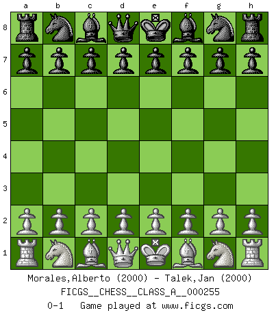 Last move : 0-1 2022 March 1 23:56:12 [Event "FICGS__CHESS__CLASS_A__000255"] [Site "FICGS"] [Date "2022.01.20"] [Round "1"] [White "Morales,Alberto"] [Black "Talek,Jan"] [Result "0-1"] [WhiteElo "2000"] [BlackElo "2000"] 0-1 This chess game has been lost on time (started : 2022.01.20 21:26:37) Player Black won this chess game. Follow this game move after move (download)If you aren't afraid of Spassky, then I have removed the element of money. (Jim Slater) Im Schach nämlich geht es darum, daß Ich des Gegners klein zu kriegen, sein Ego zu zerbrechen und zu zermahlen, seine Selbstachtung zu zertreten und zu verscharren und seine ganze mißachtenswerte sogenannte Persönlichkeit ein für alle Mal tot zu hacken und zu zerstampfen und dadurch die menschliche Gesellschaft von einer stinkenden Pestbeule zu befreien. Es ist ein königliches Spiel. (Robert James Fischer) La enorme capacidad mental, en la que sin ella no puede un jugador de Ajedrez existir, es demasiado requerida por el Ajedrez al grado de que nunca podrá liberar su mente de este juego. (Albert Einstein) La vérité est comme le meilleur coup aux échecs : elle existe, mais il faut la chercher. (Arturo Perez-Reverte) Now the reason the enlightened prince and the wise general conquer the enemy whenever they move and their achievements surpass those of ordinary men is foreknowledge. (Sun Tzu)