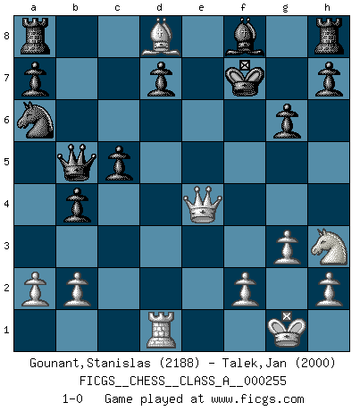 Last move : 1-0 2022 February 9 19:42:54 [Event "FICGS__CHESS__CLASS_A__000255"] [Site "FICGS"] [Date "2022.01.20"] [Round "1"] [White "Gounant,Stanislas"] [Black "Talek,Jan"] [Result "1-0"] [WhiteElo "2188"] [BlackElo "2000"] 1.d4 e6 2.c4 Nf6 3.g3 c5 4.d5 exd5 5.cxd5 b5 6.e4 Nxe4 7.Bg2 f5 8.Bxe4 Qe7 9.Nc3 fxe4 10.Nh3 b4 11.Bg5 Qe5 12.Nb5 Na6 13.O-O Bb7 14.Qh5+ g6 15.Qh4 Qxd5 16.Rad1 Qc6 17.Rfe1 Qxb5 18.Rxe4+ Kf7 19.Bd8 Bxe4 20.Qxe4 1-0 Queen's pawn Kingside Castling by player White (move 13) Player White won this chess game. Follow this game move after move (download)When your house is on fire, you can't be bothered with the neighbors. Or, as we say in Chess, if your King is under attack you don't worry about losing a Pawn on the Queen's side. (Gary Kasparov) Ich trinke, ich rauche, ich spiele, ich liebe Frauen aber Fernschach ist ein Laster, das ich nicht habe. (Mikhail Nekhemyevich Tal) El Ajedrez es un regaderazo frío para la mente. (Sir John Simon) Il vaut mieux sacrifier les pièces de l'adversaire. (Xavier Tartacover) Children in the dark cause accidents, accidents in the dark cause children. (Unknown)