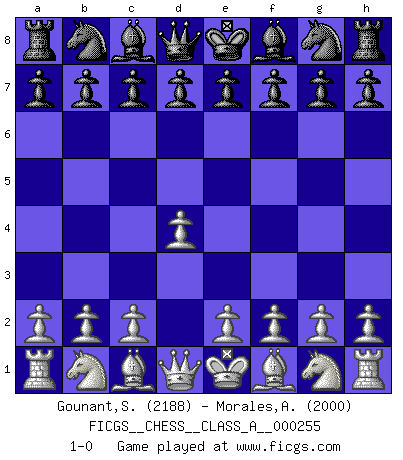 Last move : 1-0 2022 March 1 23:56:12 [Event "FICGS__CHESS__CLASS_A__000255"] [Site "FICGS"] [Date "2022.01.20"] [Round "1"] [White "Gounant,Stanislas"] [Black "Morales,Alberto"] [Result "1-0"] [WhiteElo "2188"] [BlackElo "2000"] 1.d4 1-0 This chess game has been lost on time (started : 2022.01.20 21:26:37) Queen's pawn Player White won this chess game. Follow this game move after move (download)Mistrust is the most necessary characteristic of the Chess player. (Siegbert Tarrasch) Über die Verhaftung Bobby Fischers: Warum es die Bush-Administration für nötig befindet einen 61 Jahre alten Mann zu hetzten, der für niemanden ausser sich selbste eine Gefahr darstellt ist ein Rätsel. (Nigel Short) No hay precio que no valga la pena por la cabellera del Rey enemigo. (Koblentz) Les pièces de l'échiquier étaient impitoyables. Elles le retenaient, elles l'absorbaient. Il y avait de l'horreur en cela, mais aussi une harmonie unique. Car, qu'y a-t-il dans le monde, à part les échecs ? (V. Nabokov) Perhaps chess is the wrong game for the times (The Chess Master and the Computer, by Garry Kasparov - 2010)