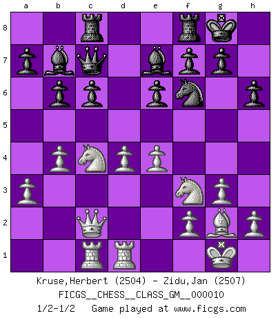 Last move : 1/2-1/2 2022 March 11 9:21:13 [Event "FICGS__CHESS__CLASS_GM__000010"] [Site "FICGS"] [Date "2022.01.21"] [Round "1"] [White "Kruse,Herbert"] [Black "Zidu,Jan"] [Result "1/2-1/2"] [WhiteElo "2504"] [BlackElo "2507"] 1.d4 Nf6 2.c4 e6 3.g3 d5 4.Nf3 Bb4+ 5.Bd2 Be7 6.Bg2 O-O 7.O-O c6 8.Qc2 Nbd7 9.Bf4 b6 10.Rd1 Ba6 11.Nbd2 Nh5 12.Be3 Nhf6 13.Bg5 h6 14.Bxf6 Nxf6 15.Rac1 Rc8 16.e4 dxc4 17.Nxc4 Qc7 18.a3 Bb7 19.b4 1/2-1/2 Catalan Opening Kingside Castling by player Black (move 6) Kingside Castling by player White (move 7) This chess game ended in a draw. Follow this game move after move (download)All my games are real. (Bobby Fischer) Schach ist ein Reich, wo sich die menschliche Phantasie frei entfalten kann. (David Bronstein) Fischer no está bajo la obligación de nadie. (Joseph Platz) La tactique, c'est ce que vous faites quand il y a quelque chose à faire; la stratégie, c'est ce que vous faites quand il n'y a rien à faire. (Savielli Tartacower) I couldn't make any sense out of what this particular thread is about. It sounds like R2 D2 computer speaking. A space fight ?!? Some 'command' problems in Moscow ? Some killers & narcotic addicts attacking some game & a god wannabe ?? (Dinesh De Silva, lost in a russian conflict in FICGS forum)
