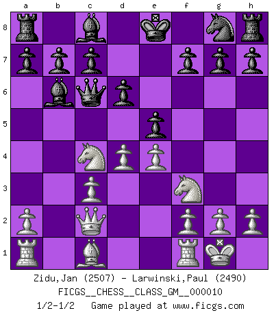 Last move : 1/2-1/2 2022 February 9 22:3:3 [Event "FICGS__CHESS__CLASS_GM__000010"] [Site "FICGS"] [Date "2022.01.21"] [Round "1"] [White "Zidu,Jan"] [Black "Larwinski,Paul"] [Result "1/2-1/2"] [WhiteElo "2507"] [BlackElo "2490"] 1.e4 e5 2.Nf3 Nc6 3.Bc4 Bc5 4.b4 Bxb4 5.c3 Ba5 6.d4 d6 7.Qb3 Qd7 8.O-O Bb6 9.Nbd2 Na5 10.Qc2 Nxc4 11.Nxc4 Qc6 1/2-1/2 Evans gambit : Tartakower attack Kingside Castling by player White (move 8) This chess game ended in a draw. Follow this game move after move (download)The older I grow, the more I value Pawns. (Keres) Die meiste Zeit treffe ich auf Gegner, die meine Enkel sein könnten. Ich bin da, um ihnen zu zeigen, dass sie von mir noch einiges lernen können. (Viktor Kortschnoi) Algunos sacrificios son sólidos, los demás son míos. (Mikhail Tal) Il vaut mieux sacrifier les pièces de l'adversaire. (Xavier Tartacover) I would love to change the world, but they won't give me the source code. (Unknown)