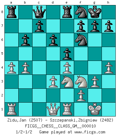 Last move : 1/2-1/2 2022 March 17 15:59:31 [Event "FICGS__CHESS__CLASS_GM__000010"] [Site "FICGS"] [Date "2022.01.21"] [Round "1"] [White "Zidu,Jan"] [Black "Szczepanski,Zbigniew"] [Result "1/2-1/2"] [WhiteElo "2507"] [BlackElo "2482"] 1.e4 e5 2.Nf3 Nc6 3.Bc4 Nf6 4.d3 Bc5 5.c3 d6 6.O-O O-O 7.Nbd2 a5 8.Re1 Be6 9.Bb5 Qb8 10.Nf1 Qa7 11.Be3 Bxe3 12.Nxe3 Ne7 13.a4 Ng6 14.Bc4 Bxc4 15.Nxc4 Rfe8 16.g3 Qb8 17.Ne3 Nf8 18.h4 Qc8 19.b4 axb4 20.cxb4 b6 1/2-1/2 Two knights defense (Modern Bishop's Opening) Kingside Castling by player White (move 6) Kingside Castling by player Black (move 6) This chess game ended in a draw. Follow this game move after move (download)White lost because he failed to remember the right continuation and had to think up the moves himself. (Siegbert Tarrasch) Wer der Ansicht ist, daß alle Schachspieler verrückt sind, wird durch Studium des Lebens von Emil Josef Diemer nicht auf andere Gedanken kommen. (Hans Ree) En la vida, como en el Ajedrez, los Peones propios obstruyen nuestro camino. La gran fortuna de un hombre, su comodidad, placer, hijos, libros, que deberían ayudarle a ganar, con mucha frecuencia lo ponen en Jaque Mate. (Charles Buxton) Aux échecs, l'amour-propre est satisfait quand on remporte la victoire, mais il n'y a pas de honte à être battu. (Benjamin Franklin) If we don't succeed, we run the risk of failure. (George W. Bush)