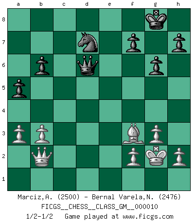 Last move : 1/2-1/2 2022 March 8 16:16:3 [Event "FICGS__CHESS__CLASS_GM__000010"] [Site "FICGS"] [Date "2022.01.21"] [Round "1"] [White "Marciz,Alexander"] [Black "Bernal Varela,Nelson"] [Result "1/2-1/2"] [WhiteElo "2500"] [BlackElo "2476"] 1.d4 e6 2.Nf3 d5 3.c4 c6 4.e3 Nd7 5.Bd3 dxc4 6.Bxc4 Ngf6 7.O-O Bd6 8.b3 O-O 9.Bb2 Qe7 10.Ne5 c5 11.Qf3 Rd8 12.Rd1 cxd4 13.exd4 Nd5 14.Nd2 N7f6 15.Bd3 Bd7 16.Ndc4 a5 17.Nxd7 Rxd7 18.g3 Rc7 19.a3 Qd8 20.Re1 Bf8 21.Ne5 Rac8 22.Rac1 Rxc1 23.Rxc1 Rxc1+ 24.Bxc1 Qc7 25.Bb2 g6 26.Qe2 Nd7 27.Nc4 Bg7 28.Qc2 Ne7 29.Ne3 Qd8 30.Be4 b6 31.d5 exd5 32.Nxd5 Bxb2 33.Qxb2 Nxd5 34.Bxd5 Qe7 35.Kg2 Qd6 36.Bf3 1/2-1/2 Queen's pawn Kingside Castling by player White (move 7) Kingside Castling by player Black (move 8) This chess game ended in a draw. Follow this game move after move (download)In complicated positions, Bobby Fischer hardly had to be afraid of anybody. (Paul Keres) Schach ist das schnellste Spiel der Welt, weil man in jeder Sekunde Tausende von Gedanken ordnen muß. (Albert Einstein) Aquel que ve no otra dirección en el juego que la de dar Jaque Mate a su oponente, nunca será un buen jugador de Ajedrez. (Euwe) Il n'y a pas eu de défaite parce que je ne crois pas que cet ordinateur ait jamais existé. IBM a triché en refusant d'imprimer les modes de recherche de la machine. C'est évident, pendant le match, des coups décisifs ont été joués par des êtres humains. Aujourd'hui, les meilleurs spécialistes en informatique ne peuvent toujours pas expliquer comment Deep-Blue a pu jouer contre la logique des ordinateurs. IBM a gagné une guerre de communication, mais ils sont incapables de prouver que l'ordinateur a gagné tout seul. (Garry Kasparov) Life is pleasant. Death is peaceful. It's the transition that's troublesome. (Isaac Asimov)