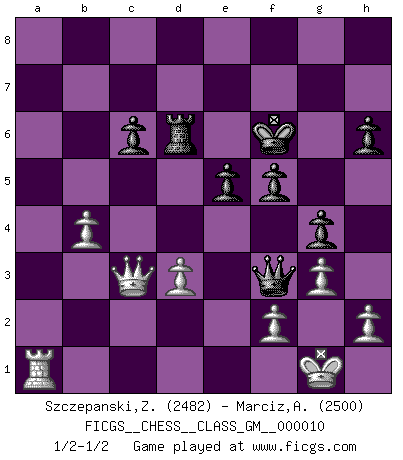 Last move : 1/2-1/2 2022 February 24 17:32:25 [Event "FICGS__CHESS__CLASS_GM__000010"] [Site "FICGS"] [Date "2022.01.21"] [Round "1"] [White "Szczepanski,Zbigniew"] [Black "Marciz,Alexander"] [Result "1/2-1/2"] [WhiteElo "2482"] [BlackElo "2500"] 1.Nf3 Nf6 2.c4 e6 3.g3 d5 4.Bg2 d4 5.e3 c5 6.d3 Nc6 7.exd4 cxd4 8.O-O Bd6 9.Bg5 h6 10.Bxf6 Qxf6 11.Nbd2 Qe7 12.a3 a5 13.Re1 O-O 14.Nb3 Qf6 15.Rc1 Bc7 16.Qc2 e5 17.Nbd2 Be6 18.Qa4 Qd8 19.Ne4 Qe7 20.Ned2 Rfd8 21.Nh4 Ra6 22.c5 g6 23.Nc4 Kg7 24.Qb5 Ra7 25.Nf3 Rd5 26.b4 axb4 27.axb4 Bb8 28.Ncd2 Ra6 29.Ra1 Na7 30.Qc4 Rxa1 31.Rxa1 Rd8 32.Qc2 Bd5 33.Ne1 Bc6 34.Nc4 Nb5 35.Bxc6 bxc6 36.Nf3 Qf6 37.Kg2 Qe6 38.Re1 f6 39.Nfd2 g5 40.Ra1 f5 41.Ra6 Qd5+ 42.Kg1 Nc3 43.Nb1 Qf3 44.Nxc3 dxc3 45.Nd6 g4 46.Ra1 Bxd6 47.cxd6 Rxd6 48.Qxc3 Kf6 1/2-1/2 Reti Opening Kingside Castling by player White (move 8) Kingside Castling by player Black (move 13) This chess game ended in a draw. Follow this game move after move (download)Chess is imagination. (David Bronstein) Am wohlsten fühle ich mich, wenn ich sehe, wie sich mein Gegner im Todeskampf windet. (Robert James Fischer) Bobby Fischer es el mas grande genio de Ajedrez de todos los tiempos. (Alexander Kotov) On est toujours la mazette de quelqu'un d'autre. (Anonyme) Go and wake up your luck. (Persian saying)