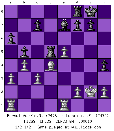 Last move : 1/2-1/2 2022 January 30 17:35:25 [Event "FICGS__CHESS__CLASS_GM__000010"] [Site "FICGS"] [Date "2022.01.21"] [Round "1"] [White "Bernal Varela,Nelson"] [Black "Larwinski,Paul"] [Result "1/2-1/2"] [WhiteElo "2476"] [BlackElo "2490"] 1.e4 e5 2.Nf3 Nc6 3.Bb5 a6 4.Ba4 Nf6 5.O-O Nxe4 6.d4 b5 7.Bb3 d5 8.dxe5 Be6 9.Be3 Be7 10.c3 O-O 11.Nbd2 Bg4 12.Nxe4 dxe4 13.Qd5 Qxd5 14.Bxd5 exf3 15.Bxc6 fxg2 16.Rfc1 Rab8 17.a3 h5 18.b4 h4 19.Kxg2 Be6 20.Bd4 Rbd8 21.Re1 Bd5+ 22.Bxd5 Rxd5 1/2-1/2 Ruy Lopez : Open, 7.Bb3 Kingside Castling by player White (move 5) Kingside Castling by player Black (move 10) This chess game ended in a draw. Follow this game move after move (download)My God, Bobby Fischer plays so simply. (Alexei Suetin) Bobby Fischer ist kein Vorbild für die heutige Jugend. (Viktor Kortschnoi) Ciertamente el estado mental actual de Bobby Fischer es una tragedia. Uno de los mas grandes jugadores de Ajedrez del mundo -el orgullo y pena del Ajedrez Americano. (Frank Brady) Tout change constamment, y compris dans le monde des Echecs. (Botvinnik) Perhaps the current trend of many chess professionals taking up the more lucrative pastime of poker is not a wholly negative one. It may not be too late for humans to relearn how to take risks in order to innovate and thereby maintain the advanced lifestyles we enjoy. And if it takes a poker-playing supercomputer to remind us that we can't enjoy the rewards without taking the risks, so be it. (The Chess Master and the Computer, by Garry Kasparov - 2010)