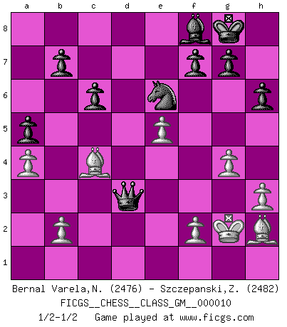 Last move : 1/2-1/2 2022 February 28 4:38:2 [Event "FICGS__CHESS__CLASS_GM__000010"] [Site "FICGS"] [Date "2022.01.21"] [Round "1"] [White "Bernal Varela,Nelson"] [Black "Szczepanski,Zbigniew"] [Result "1/2-1/2"] [WhiteElo "2476"] [BlackElo "2482"] 1.e4 e5 2.Nf3 Nc6 3.Bb5 Nf6 4.O-O Nxe4 5.Re1 Nd6 6.Nxe5 Nxe5 7.Rxe5+ Be7 8.Bf1 O-O 9.d4 Bf6 10.Re1 Re8 11.c3 Rxe1 12.Qxe1 Ne8 13.Bf4 d5 14.Nd2 Nd6 15.a4 a5 16.Qe2 Bf5 17.Nf3 c6 18.Re1 h6 19.Qd1 Be7 20.h3 Bf8 21.Ne5 Qc7 22.Bh2 Re8 23.g4 Be4 24.c4 dxc4 25.Rxe4 Nxe4 26.Bxc4 Rxe5 27.dxe5 Qe7 28.Qc2 Ng5 29.Kg2 Ne6 30.Qc3 Qd8 31.Qb3 Qd7 32.Qd3 Qxd3 1/2-1/2 Ruy Lopez : Berlin defense, Open variation Kingside Castling by player White (move 4) Kingside Castling by player Black (move 8) This chess game ended in a draw. Follow this game move after move (download)I like to say that Bobby Fischer was the greatest player ever. But what made Fischer a genius was his ability to blend an American freshness and pragmatism with Russian ideas about strategy. (Bruce Pandolfini) Vom Schach wurde gesagt das Leben sei dafür nicht lange genug. Aber das ist der Fehler des Lebens, nicht des Schach'. (Irving Chernev) No es una movida, aún la mejor movida que tu debas buscar, sino un plan comprensible. (Eugene Znosko-Borovsky) Le moment que je préfère le plus dans une rencontre, c'est celui où je sens que la personnalité de l'adversaire se brise. (Robert Fischer) Dave, my mind is going. I can feel it. (HAL 9000 in 2001, a space odyssey)