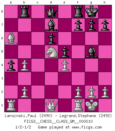 Last move : 1/2-1/2 2022 March 6 14:1:12 [Event "FICGS__CHESS__CLASS_GM__000010"] [Site "FICGS"] [Date "2022.01.21"] [Round "1"] [White "Larwinski,Paul"] [Black "Legrand,Stephane"] [Result "1/2-1/2"] [WhiteElo "2490"] [BlackElo "2492"] 1.e4 c5 2.Nf3 Nc6 3.d4 cxd4 4.Nxd4 Nf6 5.Nc3 e5 6.Ndb5 d6 7.Bg5 a6 8.Na3 b5 9.Nd5 Be7 10.Bxf6 Bxf6 11.c3 Rb8 12.Nc2 Bg5 13.a4 bxa4 14.Ncb4 Nxb4 15.cxb4 Bd7 16.Bxa6 O-O 17.O-O 1/2-1/2 Sicilian : Pelikan (Lasker/Sveshnikov) variation Kingside Castling by player Black (move 16) Kingside Castling by player White (move 17) This chess game ended in a draw. Follow this game move after move (download)It is not enough to be a good player... you must also play well. (Siegbert Tarrasch) Es ist schade, dass viele Schachsportler vergessen, wie wichtig Auftreten und angemessene Kleidung sind. (Alexandra Kosteniuk) El Ajedrez es un regaderazo frío para la mente. (Sir John Simon) Les échecs c'est le défi de l'alpiniste, toujours plus haut, prêt à tout pour monter à l'assaut du Roi ennemi. Les échecs, c'est de la musique en mouvement, un ballet majestueux pour les yeux. C'est de la poésie composée par les fantômes du passé qui au même titre que Rimbaud ou Verlaine méritent notre admiration. Les échecs, c'est de la peinture ou le moindre mouvement modifie le tableau pour en faire un Picasso ou un Van Gogh. Les échecs, c'est tout et rien, c'est la vie et la mort. Jjulie33 sur le forum de France-Echecs. Computer Science is no more about computers than astronomy is about telescopes. (Edsger W. Dijkstra)